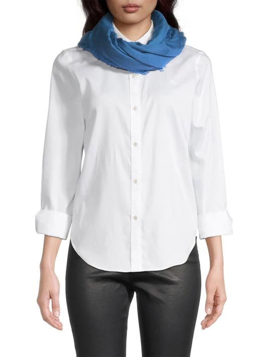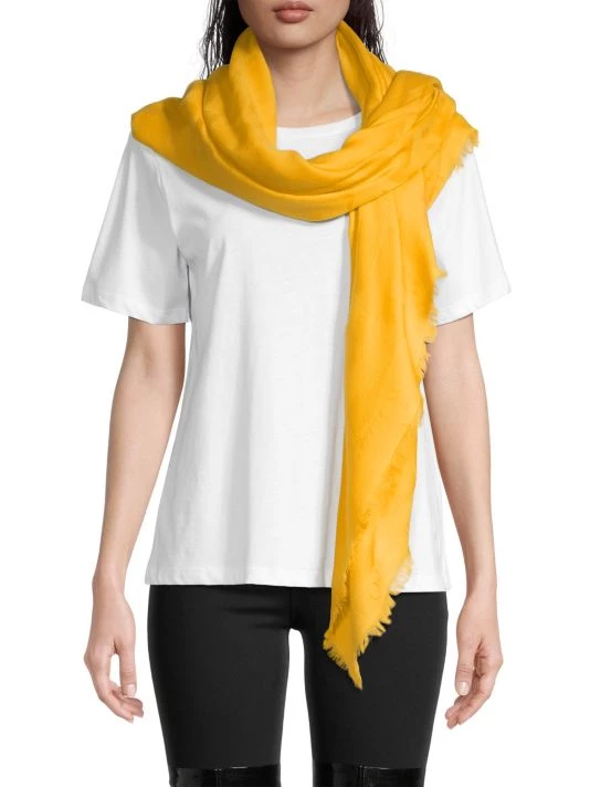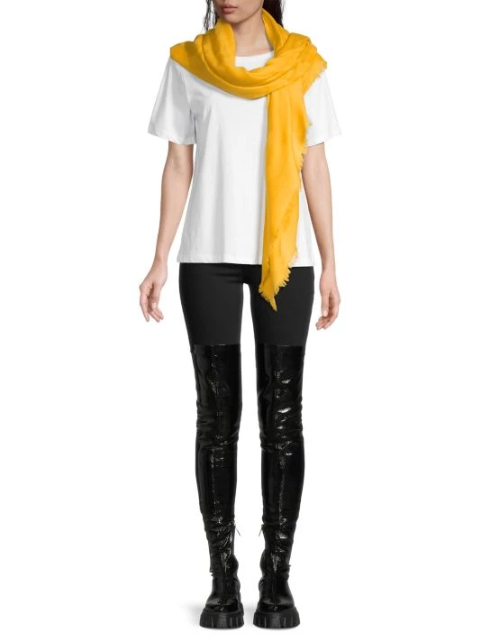 Made in Italy, Alexander McQueen’s wool shawl boasts a jacquard graffiti motif trimmed with wispy fringes.
