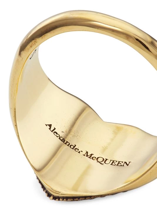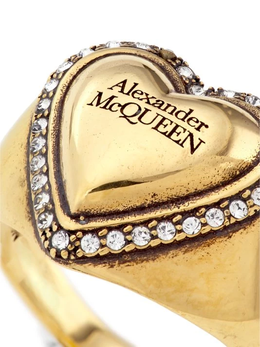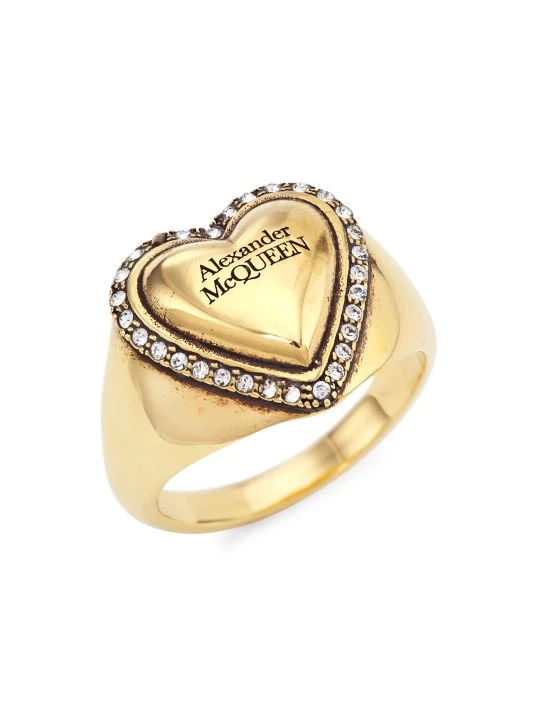 Tiny crystals encircle the logo-engraved heart center of this antiqued goldtone ring.
