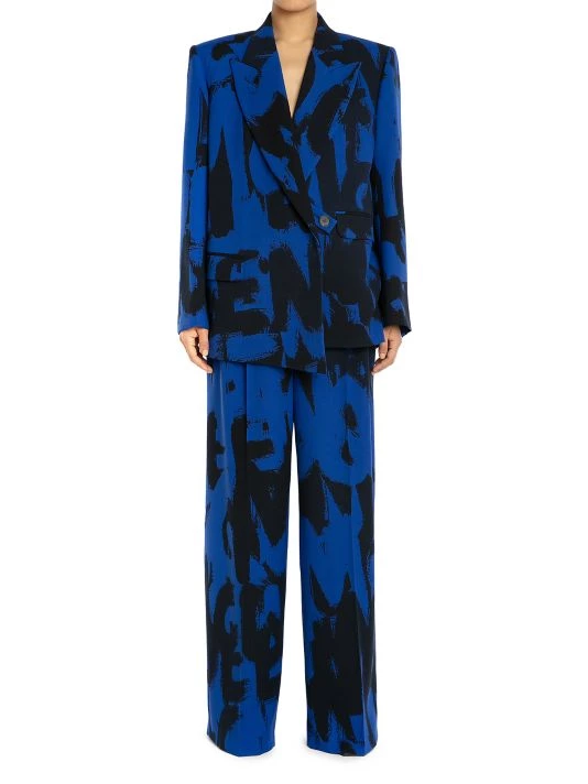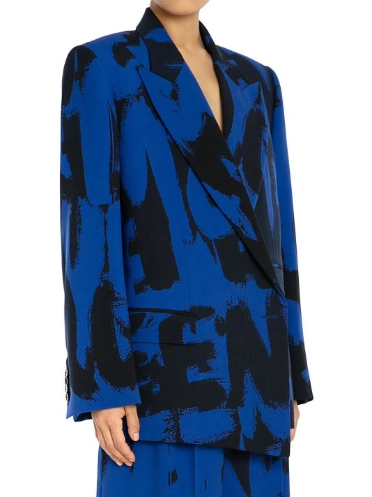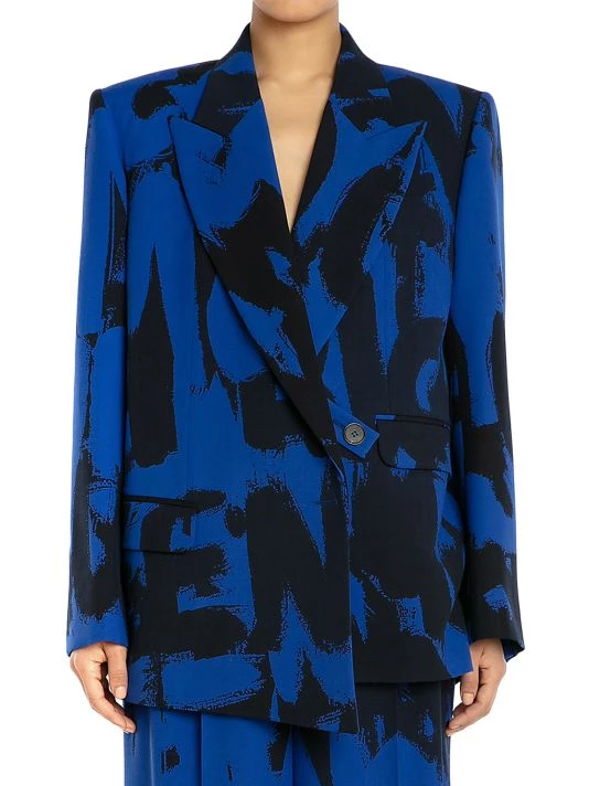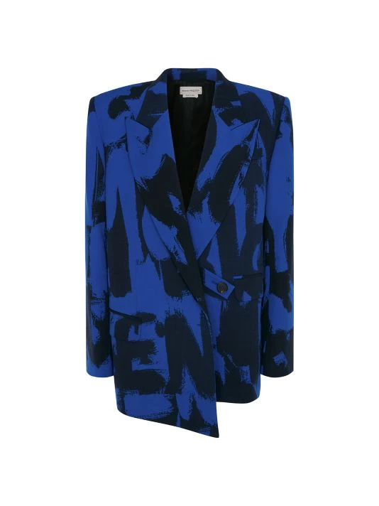 Cut in an asymmetric wrap silhouette, Alexander McQueen’s single-breasted blazer is elevated by large contrast grafitti-inspired branding.
