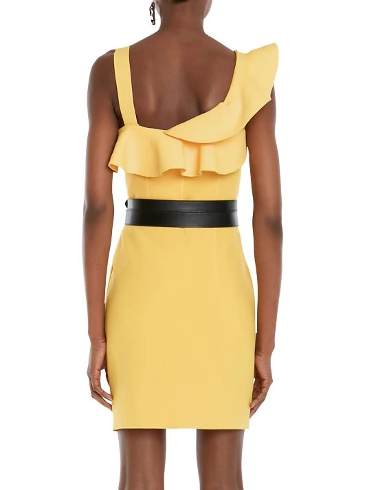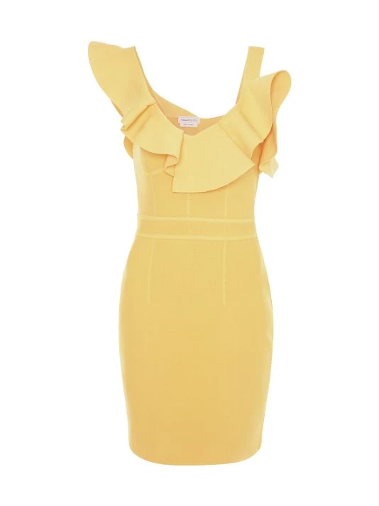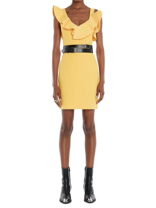 Alexander McQueen’s fitted minidress features a scoop neck adorned with romantic ruffle trim.