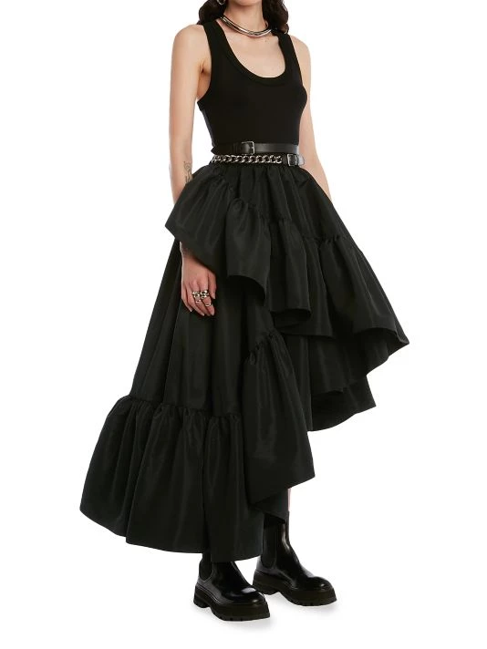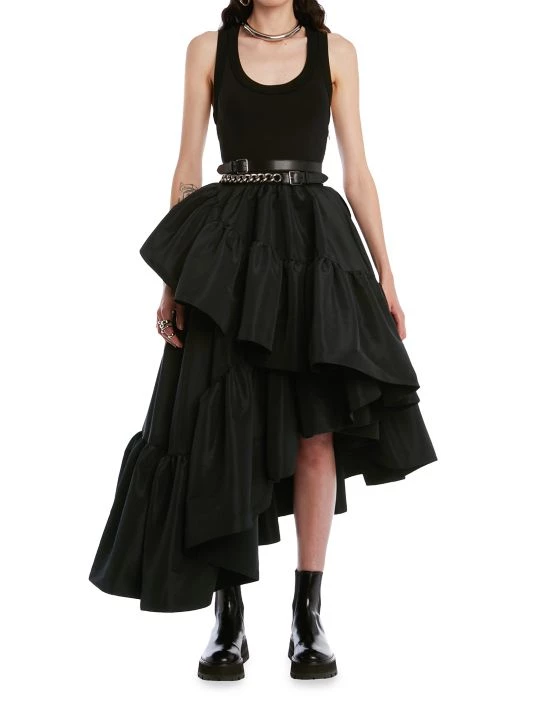 This sleeveless fit-and-flare gown is complete with a tiered, high-low satin skirt.
