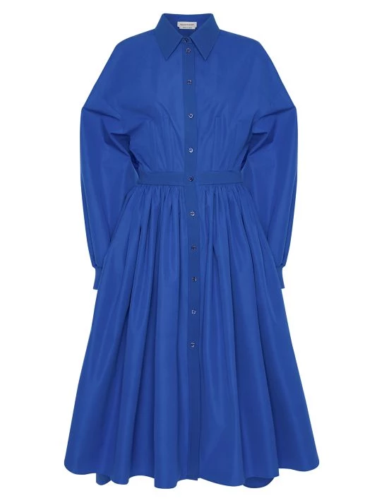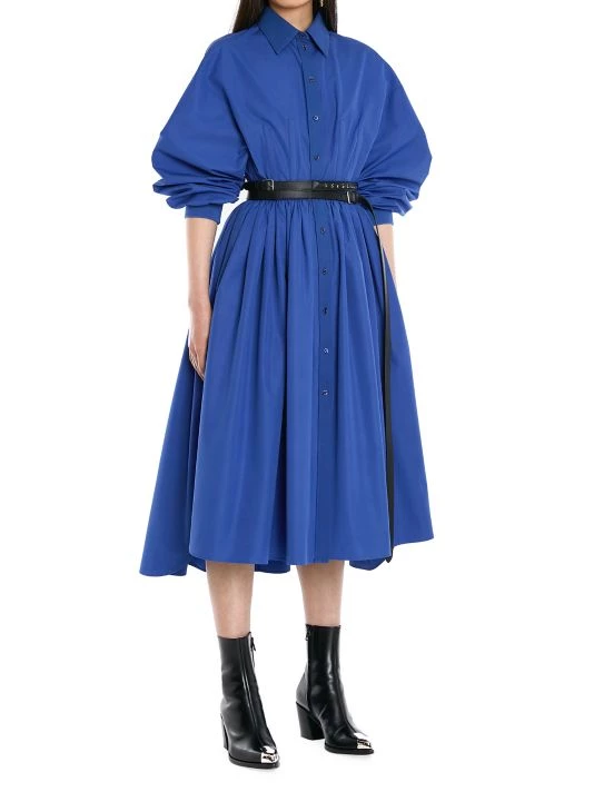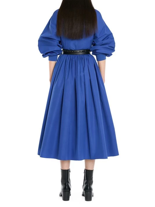 Cut in a shirt-inspired silhouette, Alexander McQueen’s midi-dress is defined by balloon sleeves and a formfitting bodice.