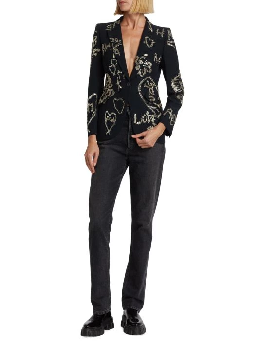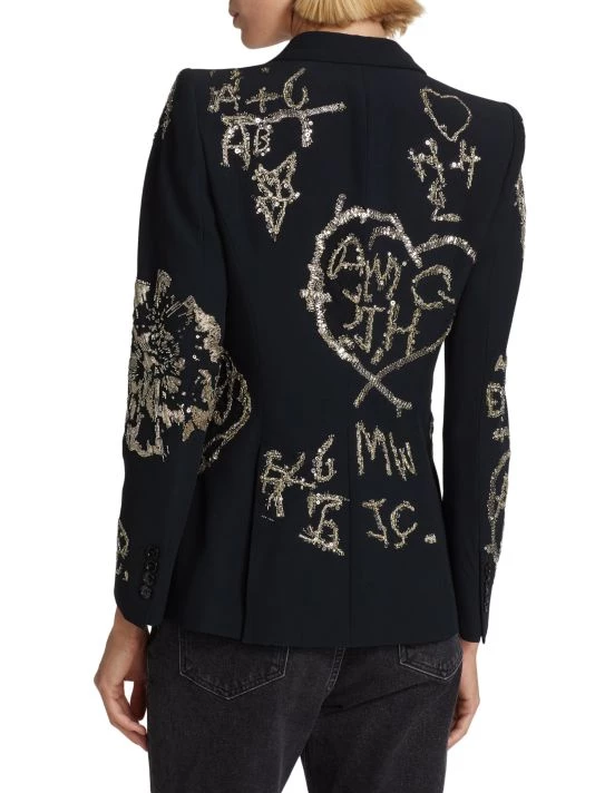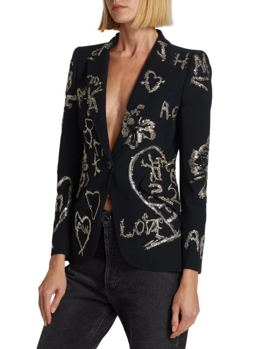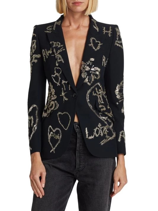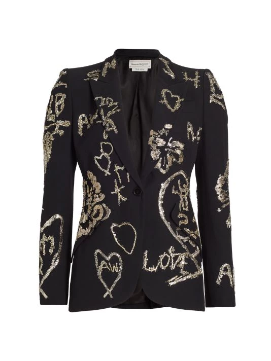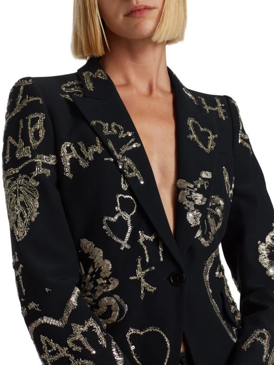 Cut in a single-breasted silhouette, Alexander McQueen’s formfitting blazer boasts beaded and sequin-embroidered patterns.