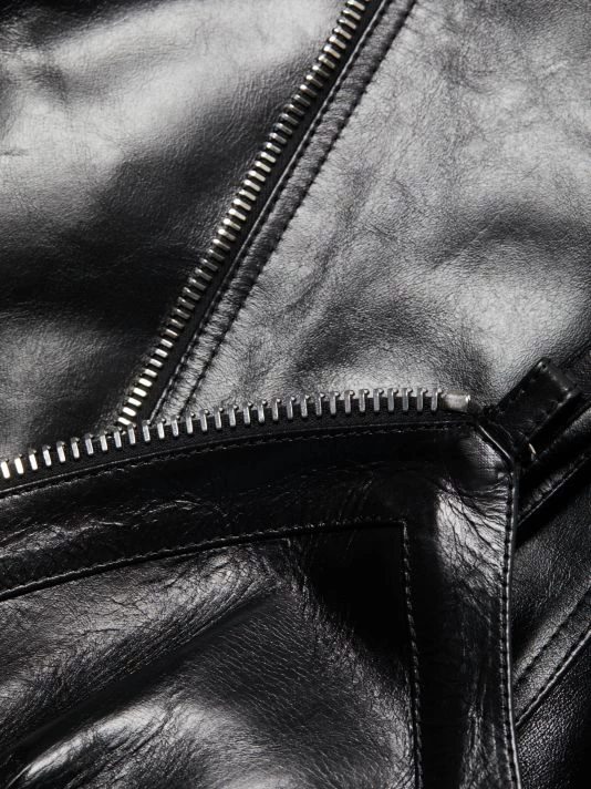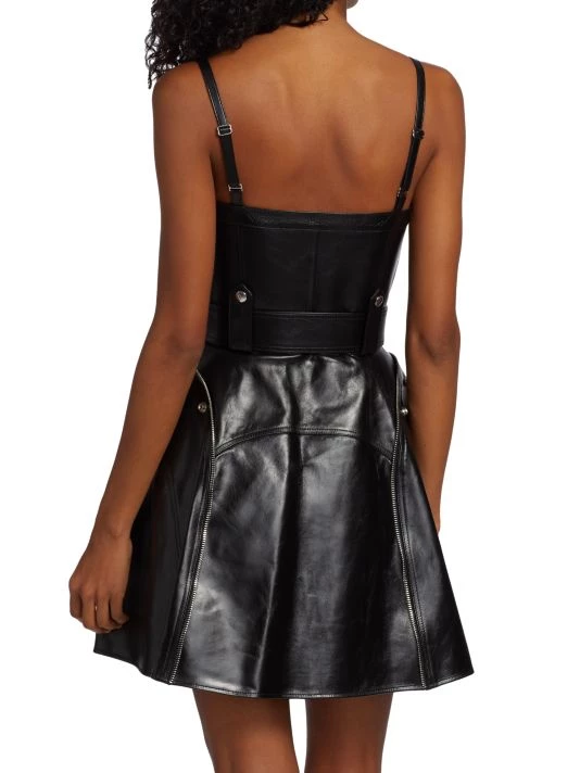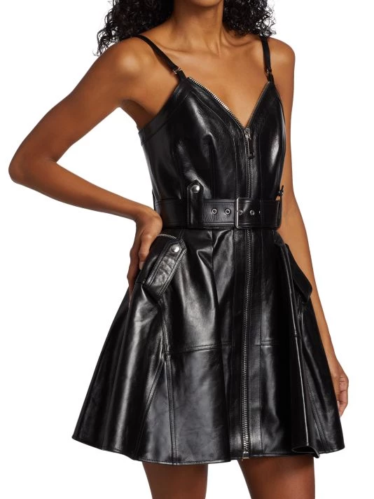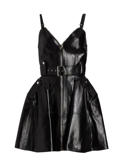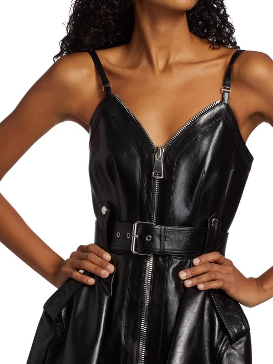 Alexander McQueen’s belted Biker dress is made of cowhide leather, featuring V-neck, adjustable straps, and exposed zip trim.