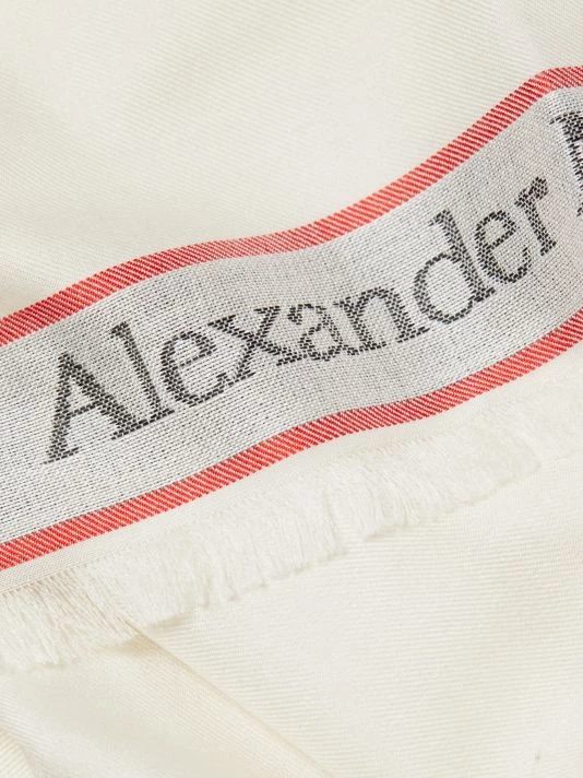 Luxurious wool and silk square scarf finished with contrasting striped border, fringed edges, and the Alexander McQueen signature.