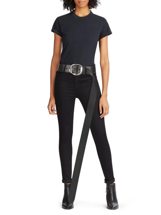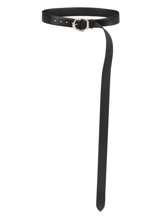 Long leather belt with defining circuluar silvertone buckle.