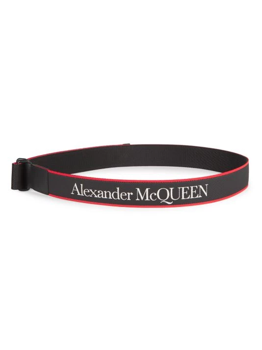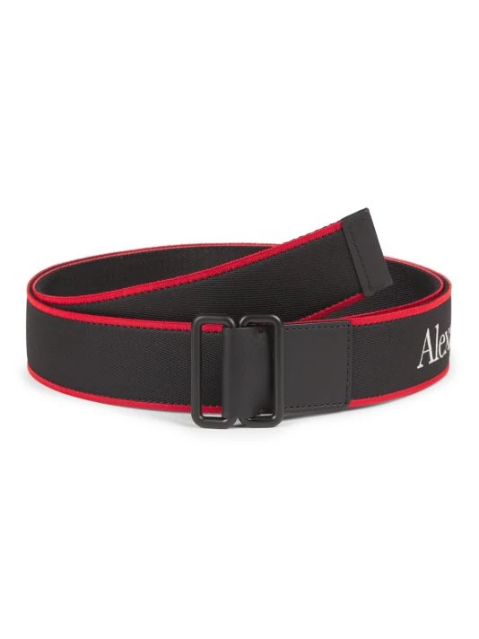 This fabric belt features an exciting red trim and contrasting Alexander McQueen logo.