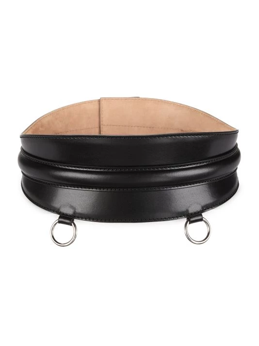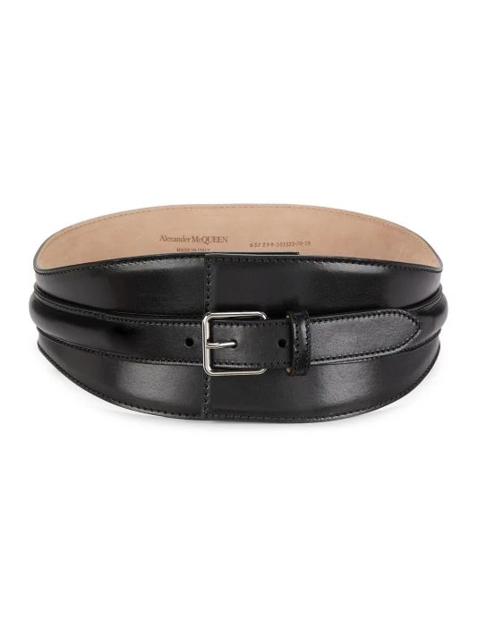 This wide leather belt has a corset-inspired cut and slim belted overlay that creates a layered piece that works to cinch the silhouette.