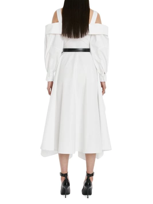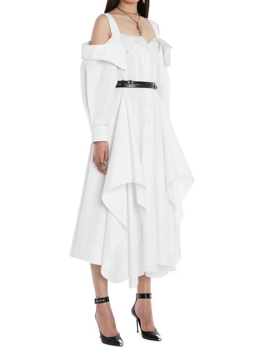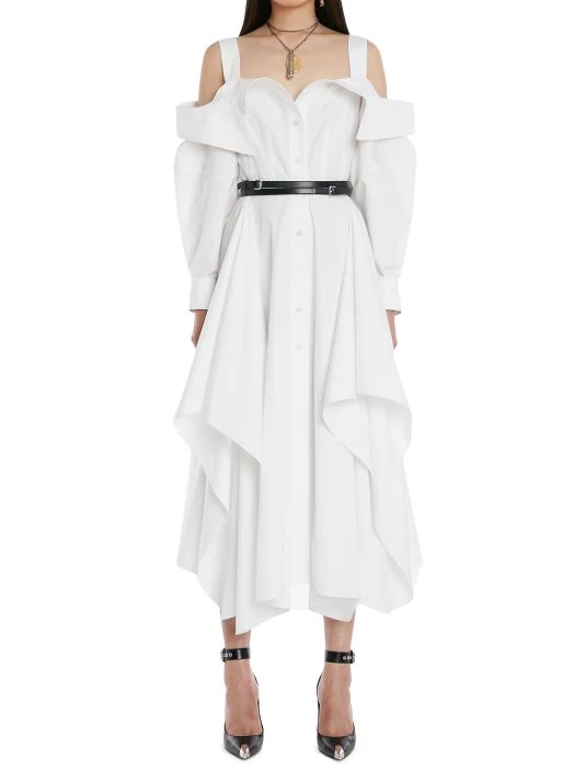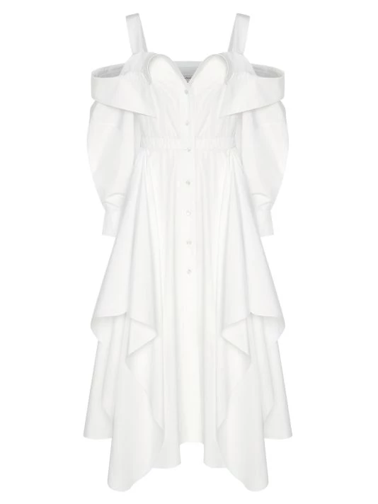 Crafted of cotton, this deconstructed shirtdress by Alexander McQueen is detailed with an off-the-shoulder neckline and ruffles at the front.