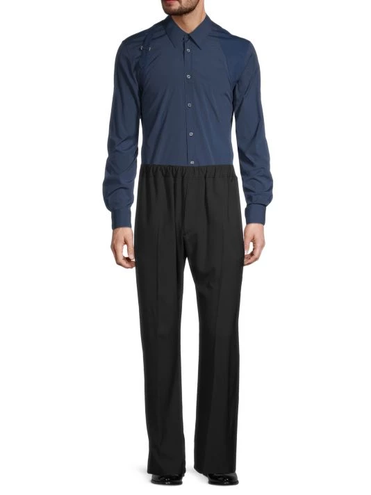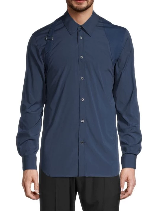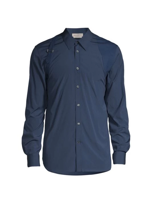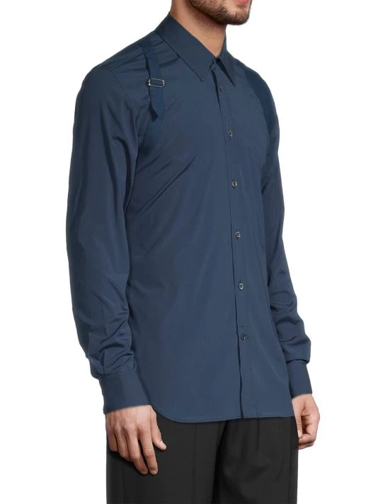 Alexander McQueen’s harness shirt features a spread collar and long sleeves. Made of cotton, this button-up style is complete with a tonal panel and buckle accent at the shoulders.
