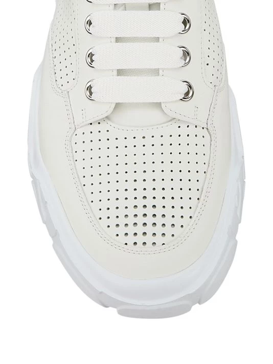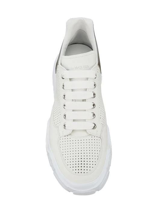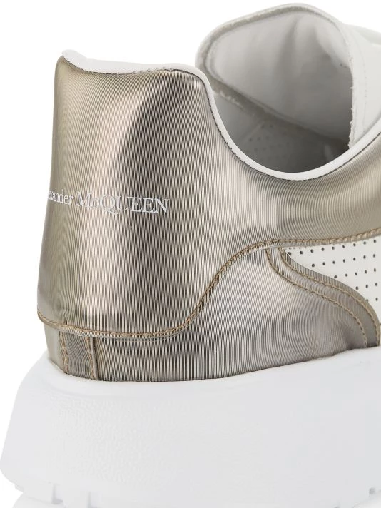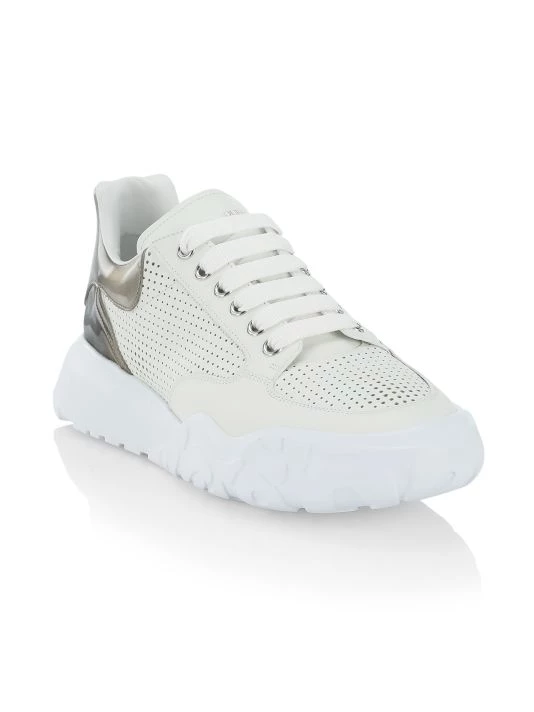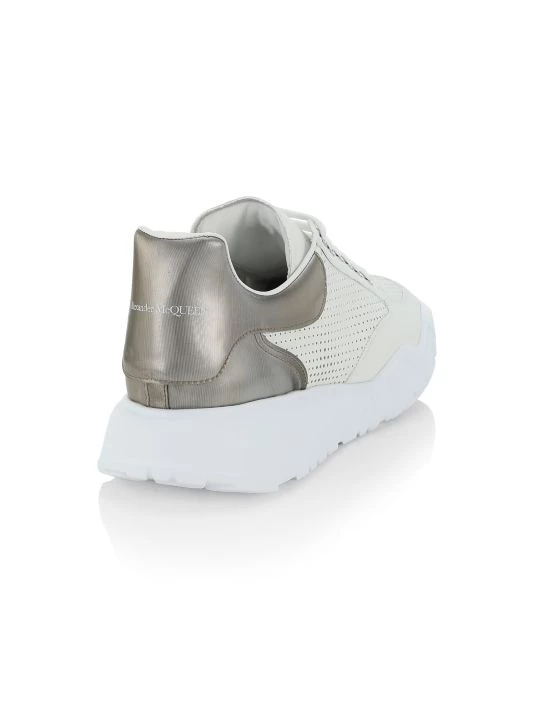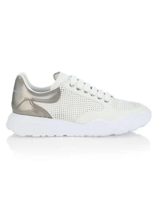 Straying from rebellious roots and offering a more romantic line, this collection was inspired by the works of English poet and painter William Blake. These low-top sneakers by Alexander McQueen are crafted of perforated leather and feature platform rubber soles and metallic heels.