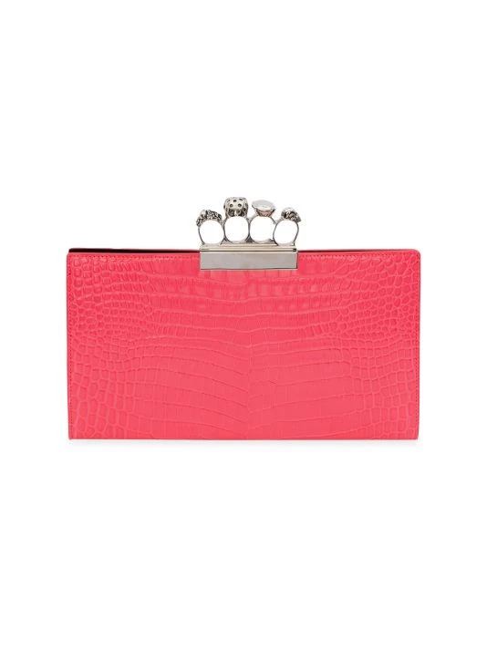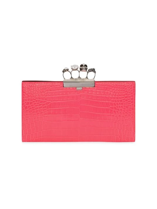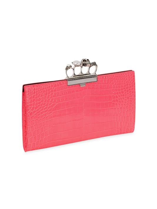 Adorned with signature four-finger skull hardware, this sleek clutch is crafted from glossy croc-embossed calfskin.