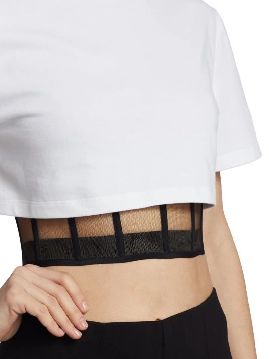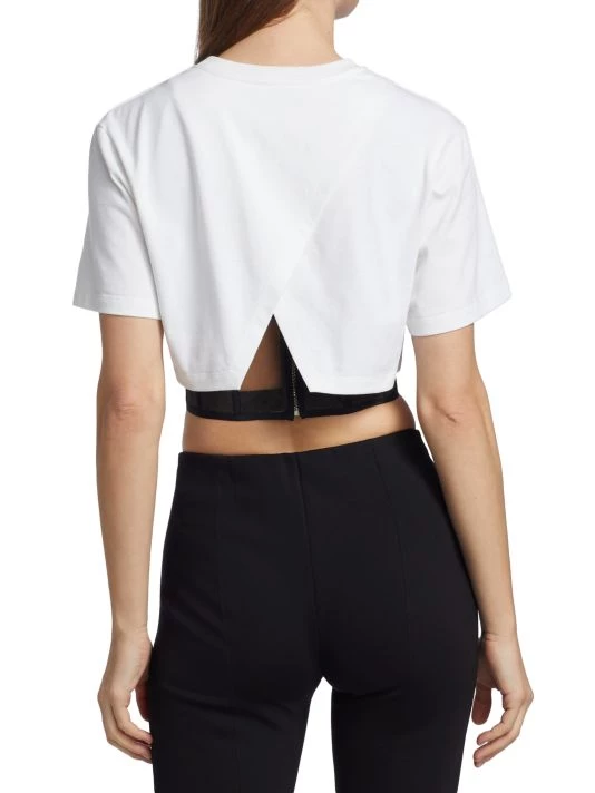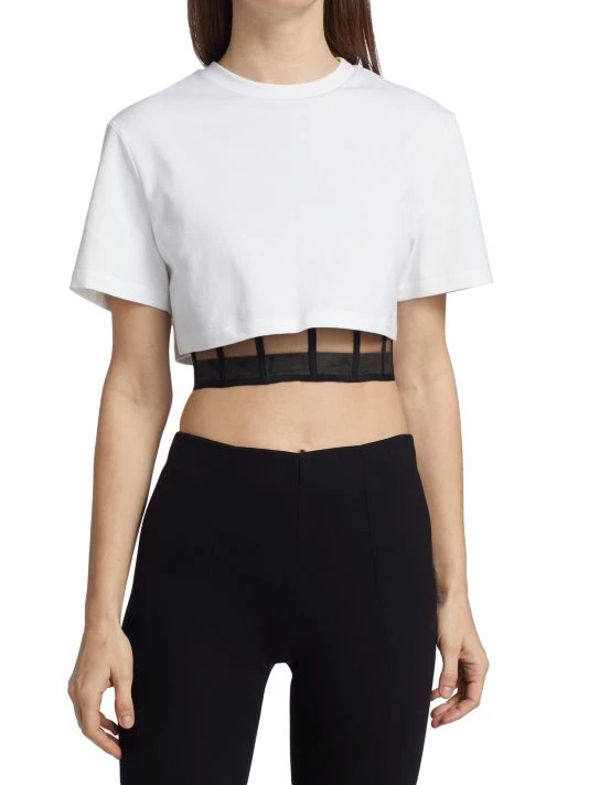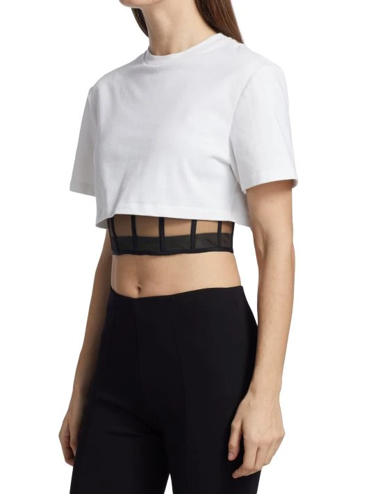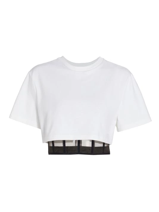 Double-layer T-shirt with a cropped length features a birdcage lining with a relaxed cotton T-shirt, finished with a surplice hem.