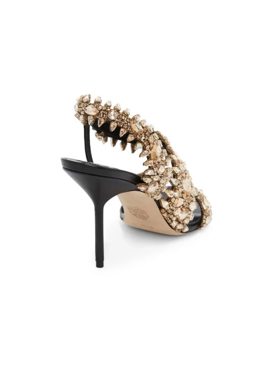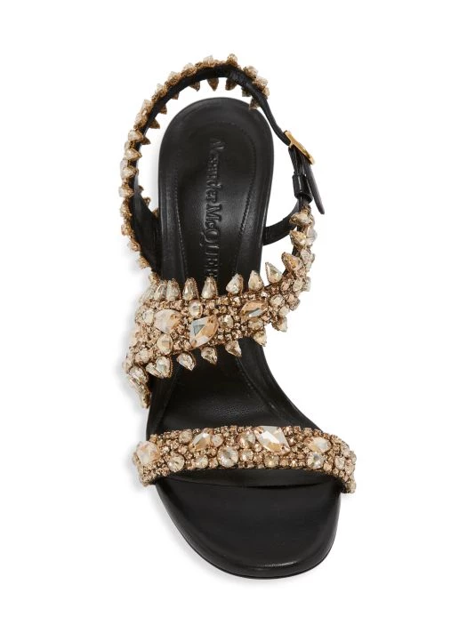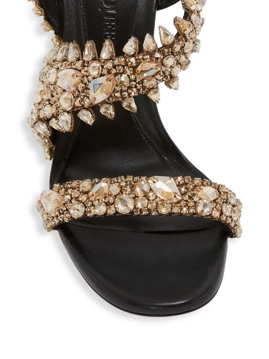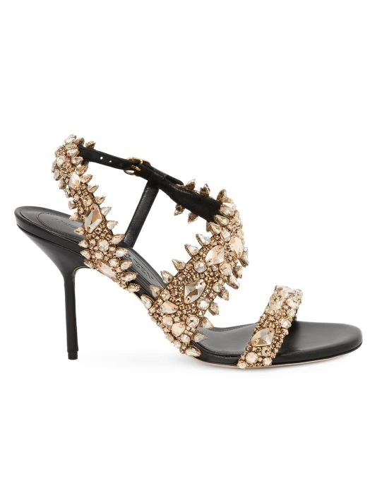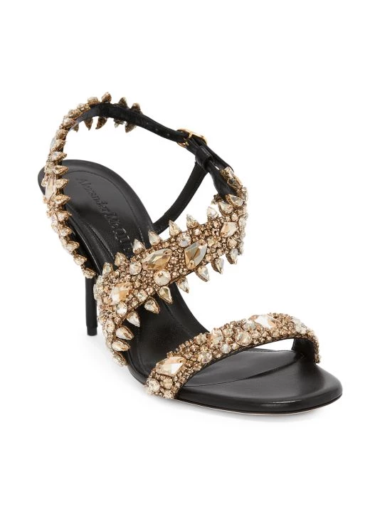 Set atop of a slender stiletto heel, chunky crystal-embellished straps adorn these round-toe sandals evoking regal elegance.