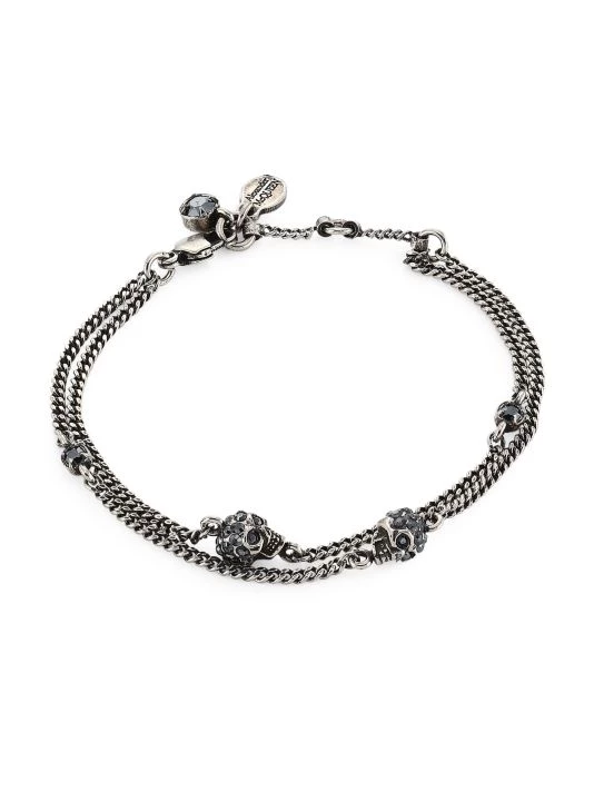 Dual chain charm bracelet dotted with edgy crystal-accented skulls, faceted crystals and an embossed logo charm.