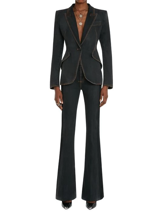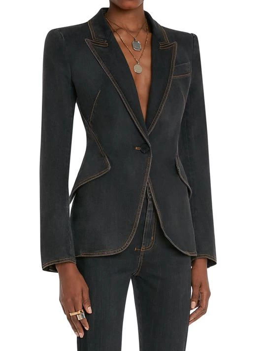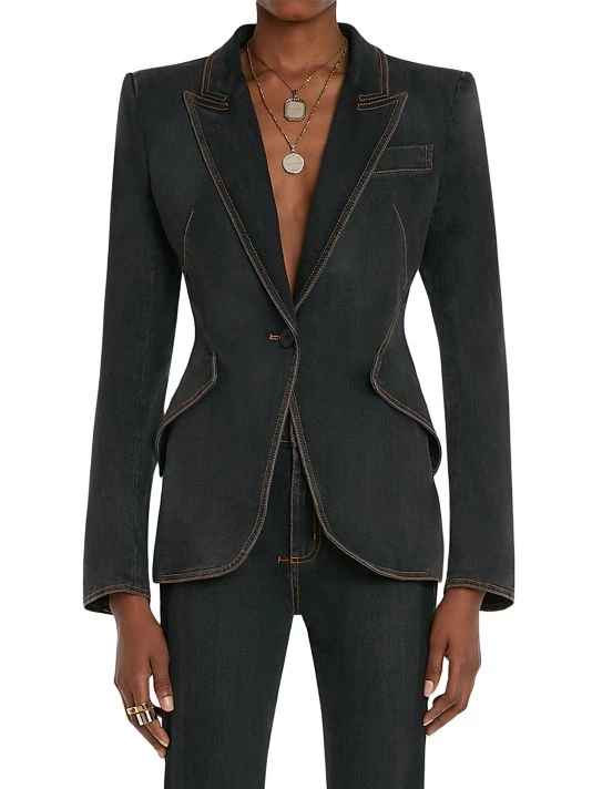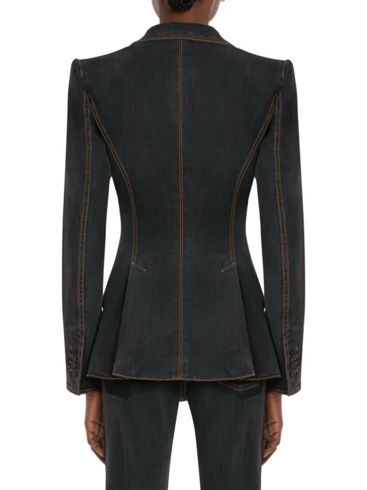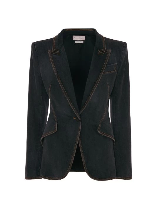 Alexander McQueen’s tailored jacket is crafted of durable denim, finished with contrast stitching highlighting the trim.