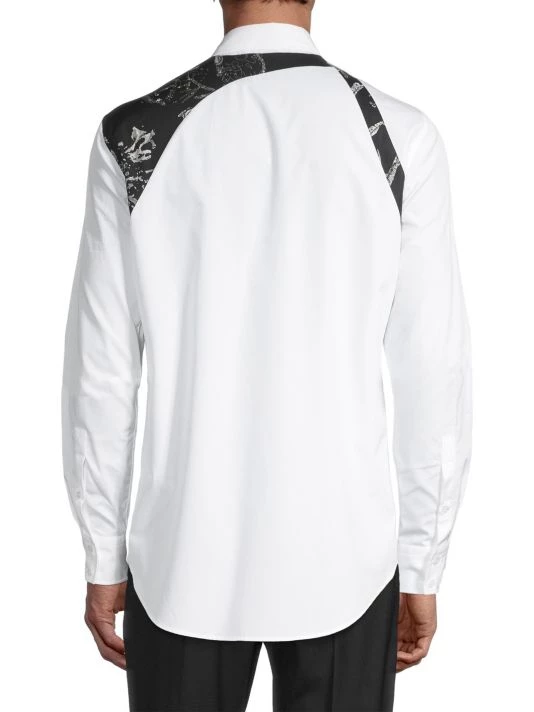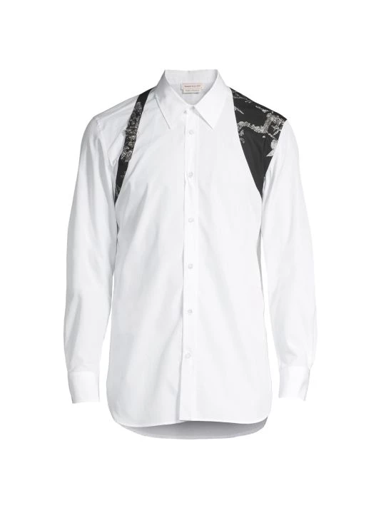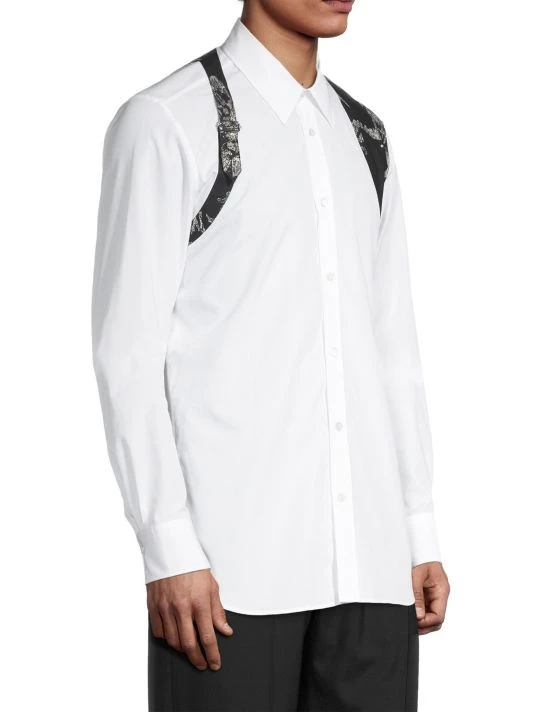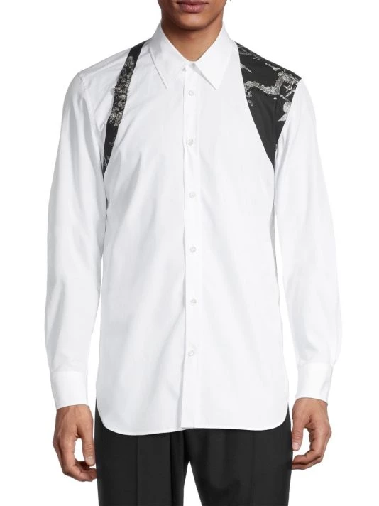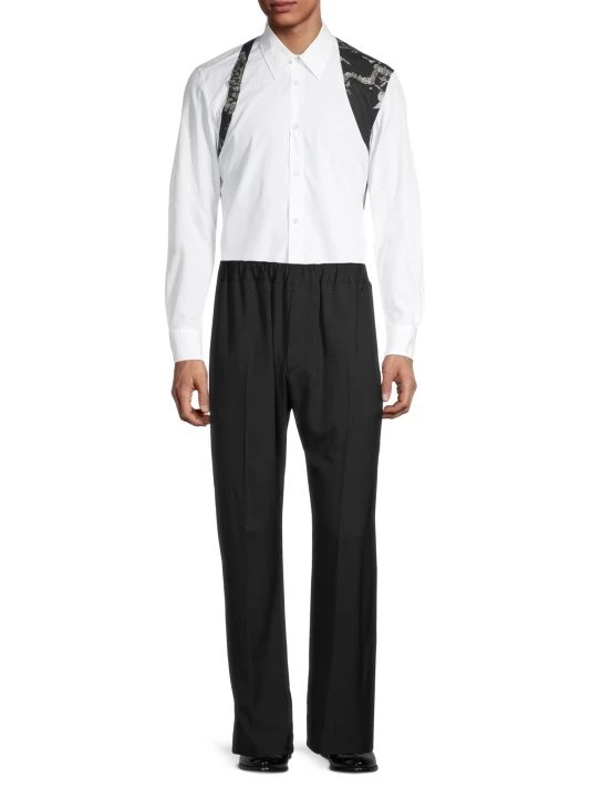 Inspired by London skies, this Alexander McQueen collection features cloud prints on linen, wool, and silk designs. Each piece encompasses casual and formal wear, from structured blazers to crewneck sweatshirts and spiked leather loafers, staying true to the brand’s slim-fit silhouettes. Crafted in Italy, a drawing-inspired scenery-designed harness enhances this classically tailored button-up shirt.