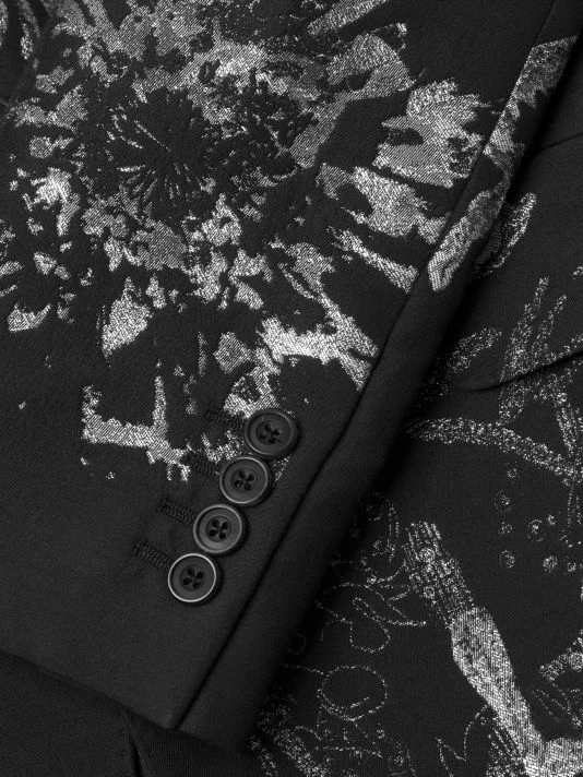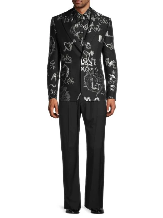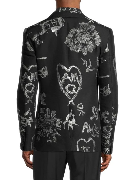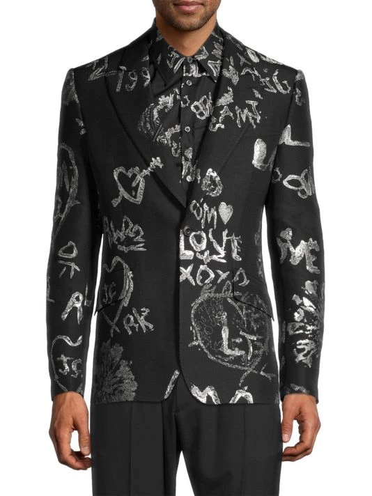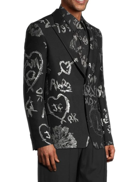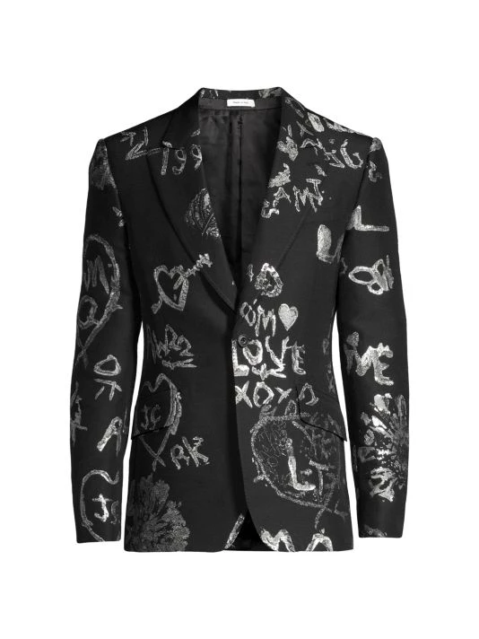 Inspired by London skies, this Alexander McQueen collection features cloud prints on linen, wool, and silk designs. Each piece encompasses casual and formal wear, from structured blazers to crewneck sweatshirts and spiked leather loafers, staying true to the brand’s slim-fit silhouettes. Crafted in Italy, this single-breasted blazer features a metallic doodle-inspired print and a tailored silhouette.