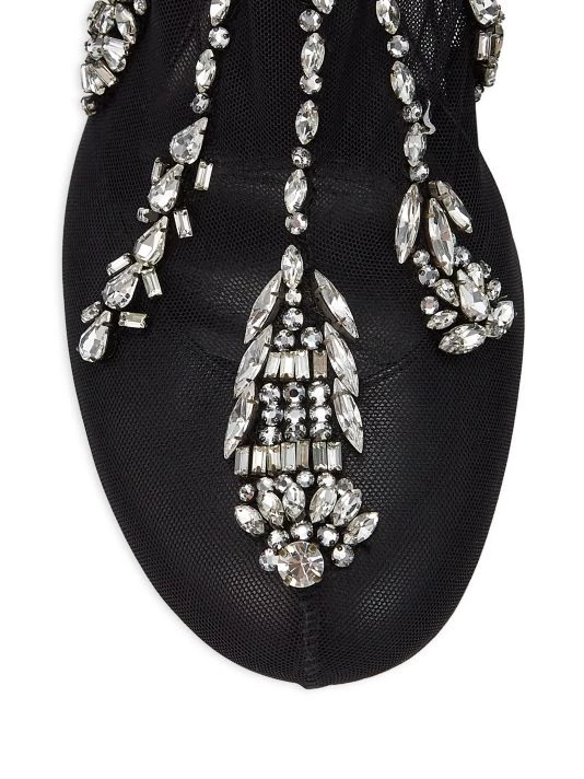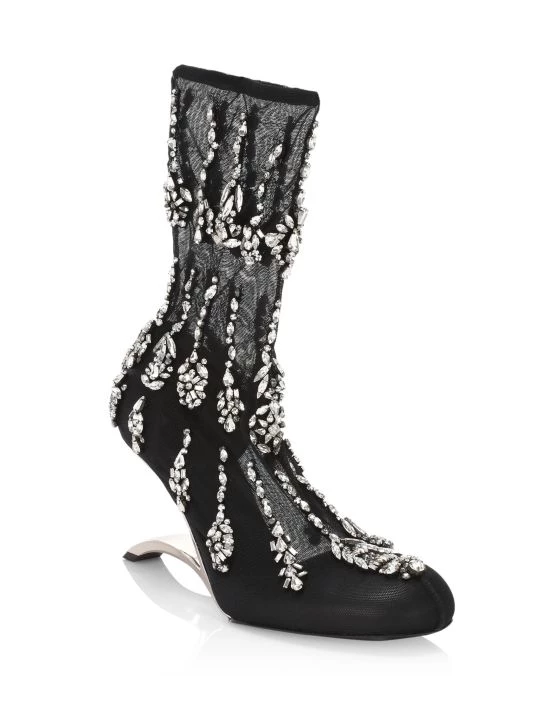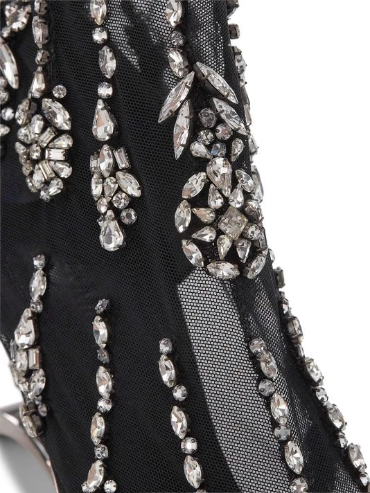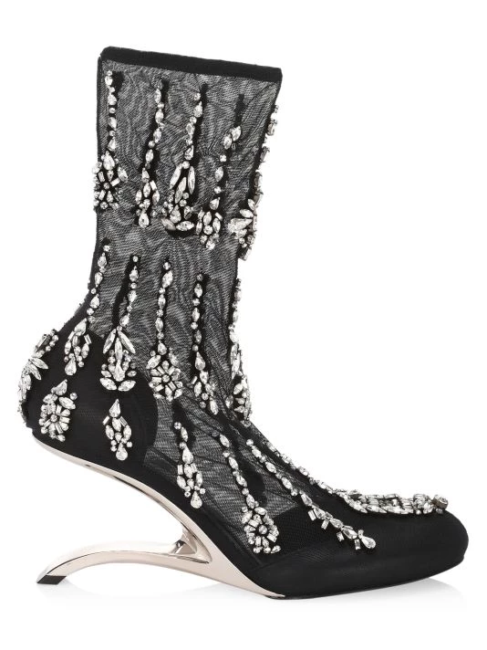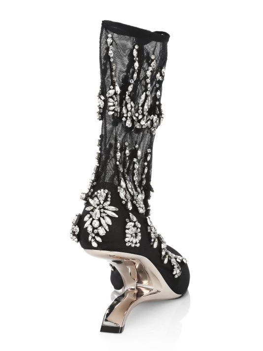 Decorated with shimmering crystals, Alexander McQueen’s boots have a breathable mesh construction. This Italian-made pair is anchored by an eye-catching sculptural heel.