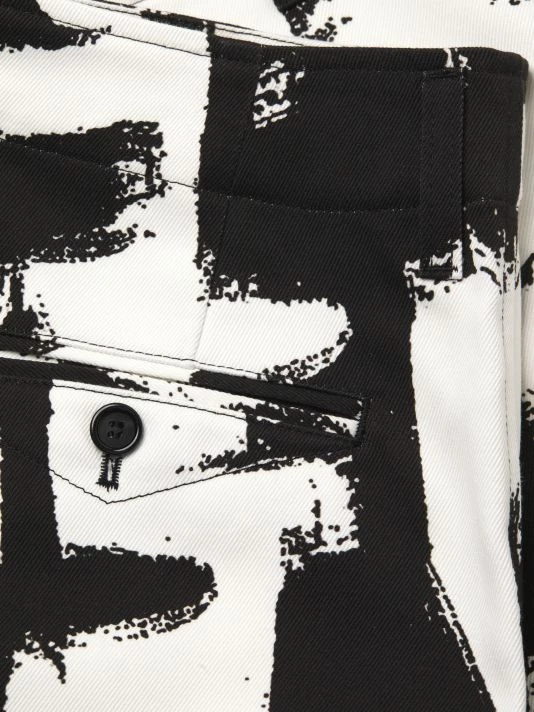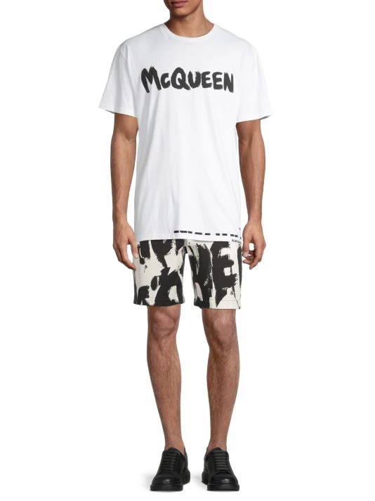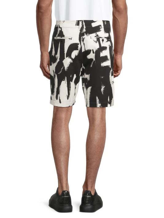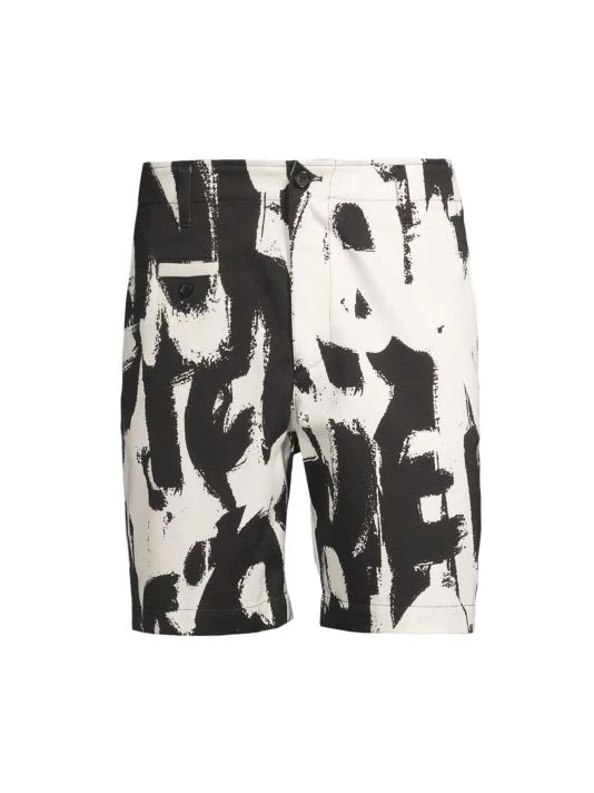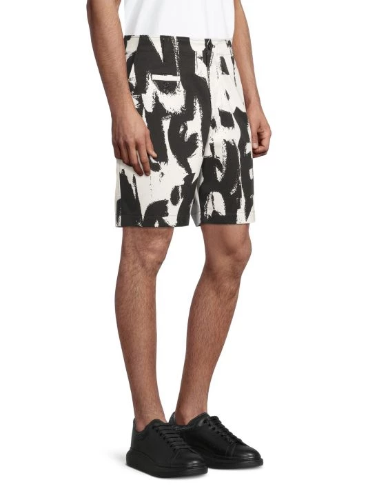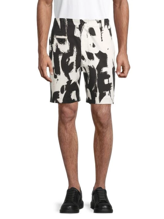Inspired by London skies, this Alexander McQueen collection features cloud prints on linen, wool, and silk designs. Each piece encompasses casual and formal wear, from structured blazers to crewneck sweatshirts and spiked leather loafers, staying true to the brand’s slim-fit silhouettes. Crafted in Italy, these chino shorts showcase an enlarged graffiti pattern.
