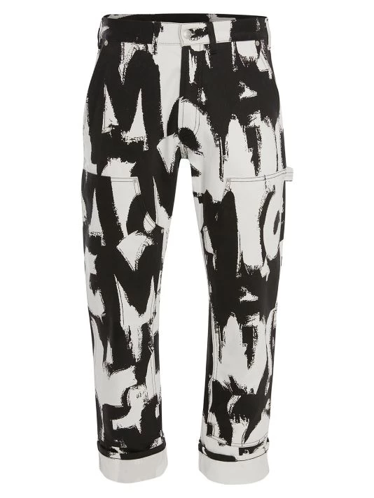 Inspired by London skies, this Alexander McQueen collection features cloud prints on linen, wool, and silk designs. Each piece encompasses casual and formal wear, from structured blazers to crewneck sweatshirts and spiked leather loafers, staying true to the brand’s slim-fit silhouettes. Designed with carpenter detailing, these graphic Alexander McQueen Exploded Graffiti jeans have a bold look.