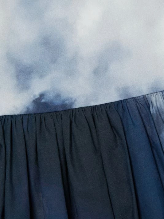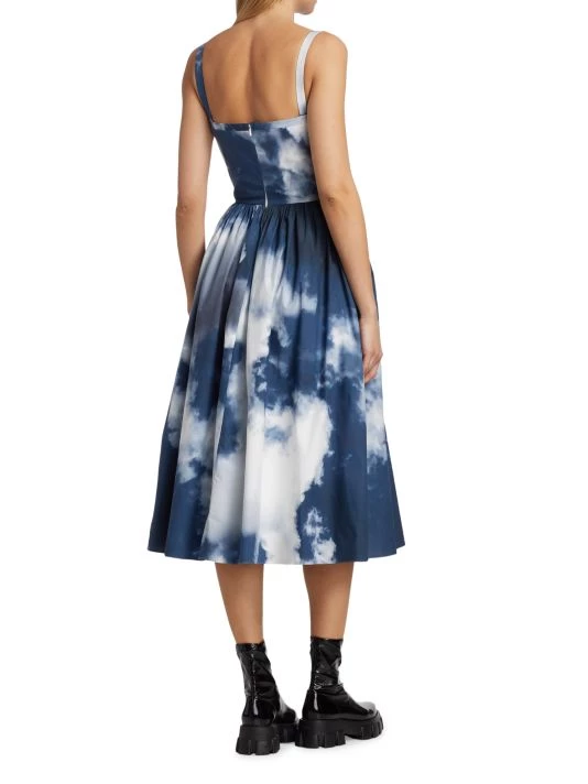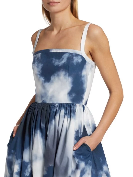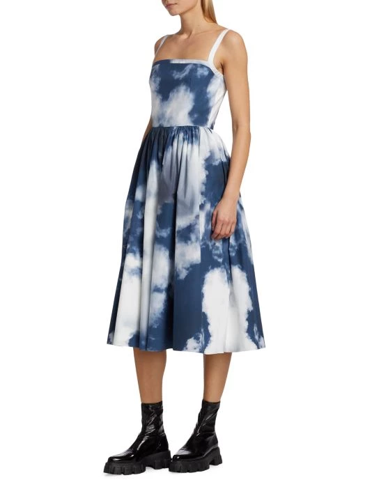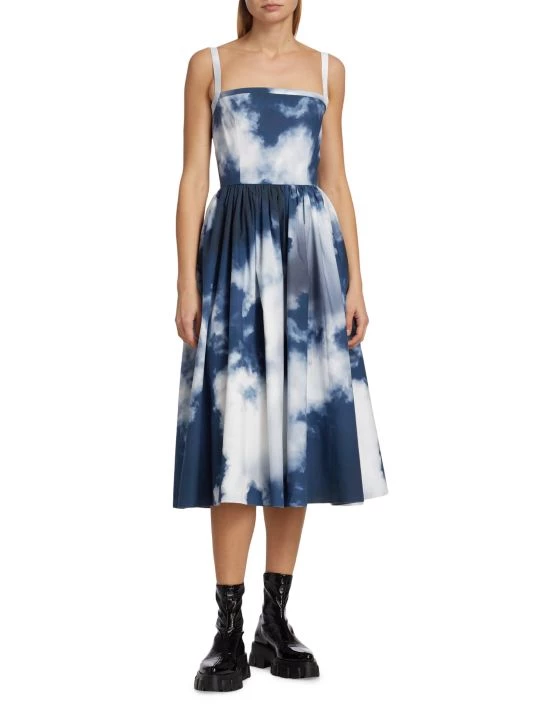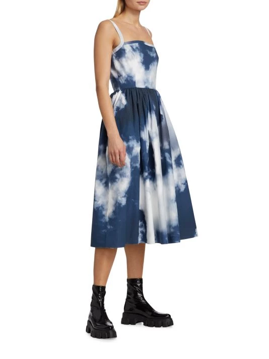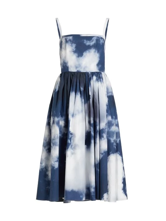 Cut in a fit-and-flare silhouette, this sleeveless midi-dress is defined by large cloud graphics and a pleated skirt.
