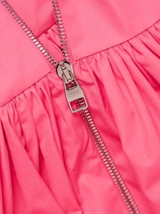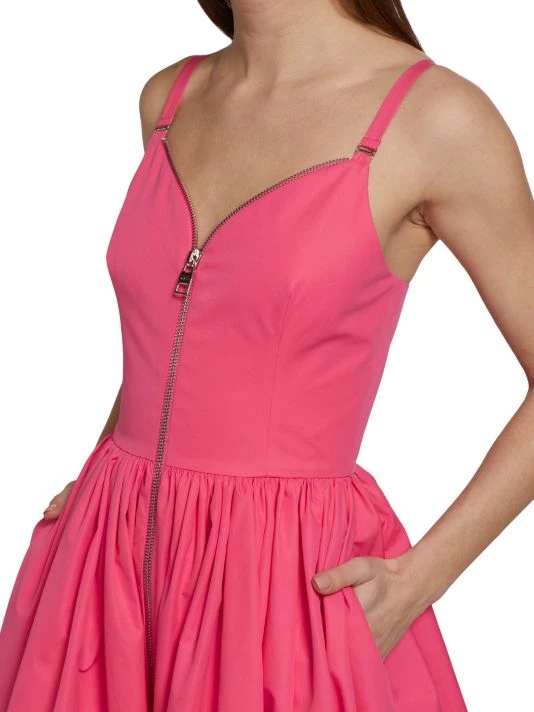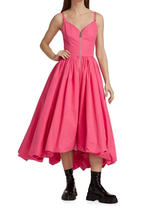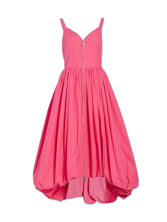 Cut in a fit-and-flare silhouette, this sleeveless gown is defined by a zip-up front and pleated, asymmetric parachute skirt.