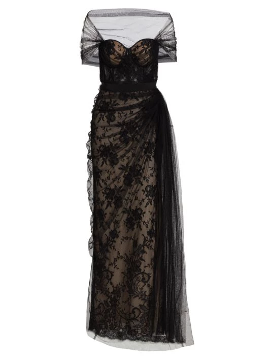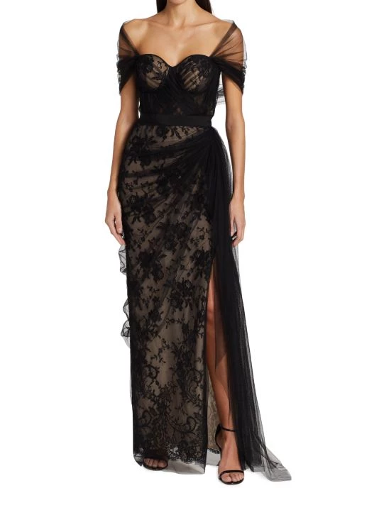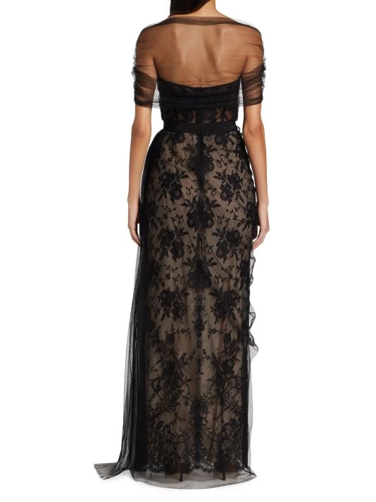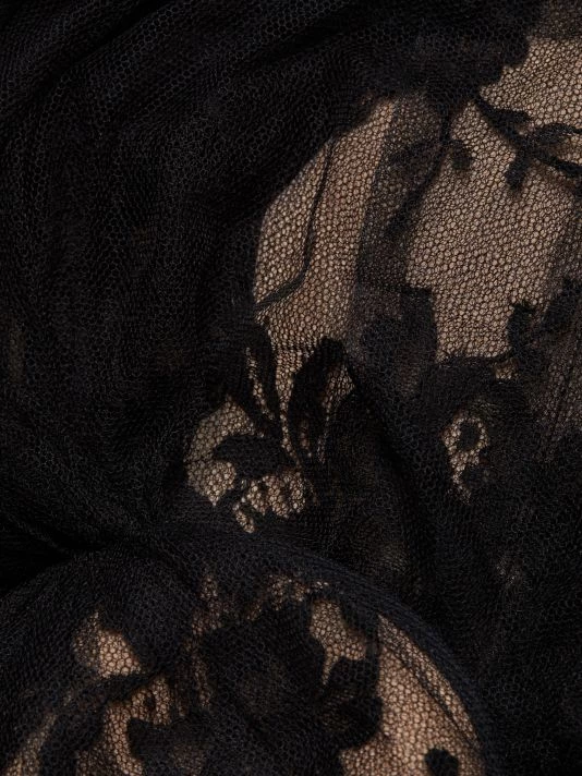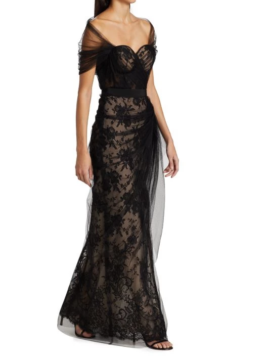 This elegant dress is draped in a sheer floral lace wrapping around the shoulder for light coverage on the backless silhouette.