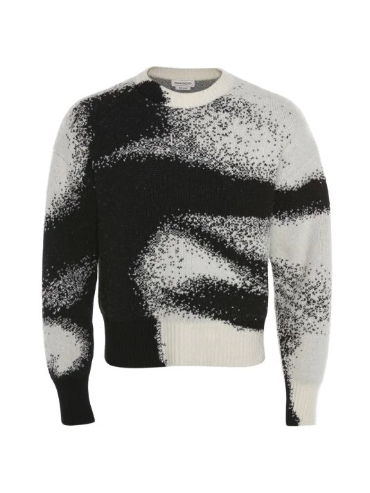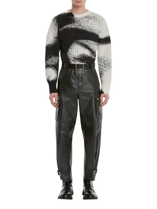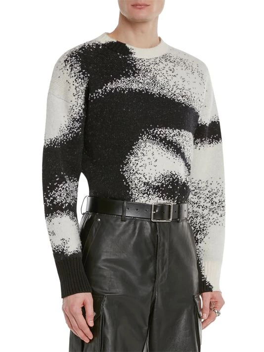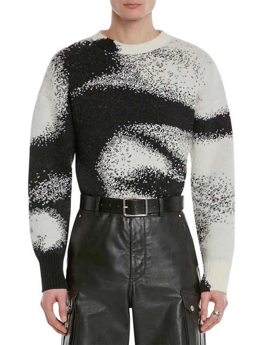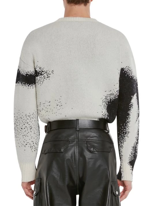 An intarsia-knit portrait logo covers Alexander McQueen’s cozy wool sweater.