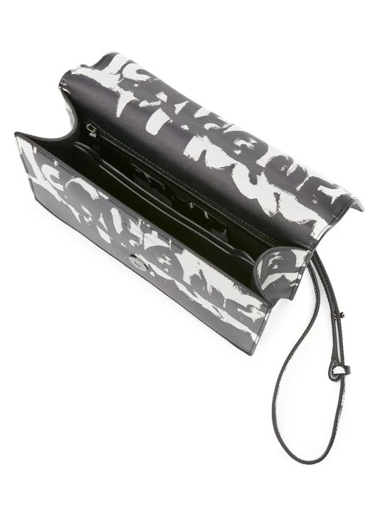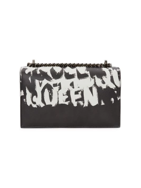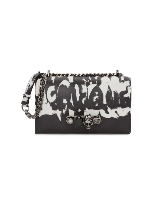 Alexander McQueen’s leather shoulder bag boasts a signature graffiti print with a jeweled skull knuckle ring.