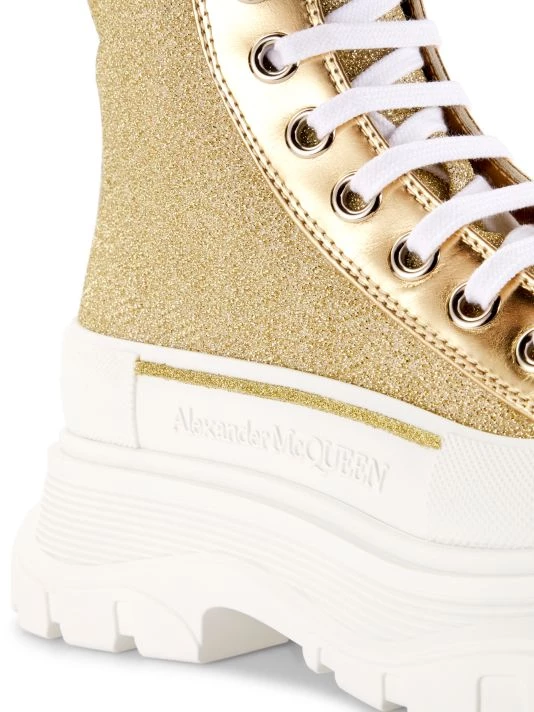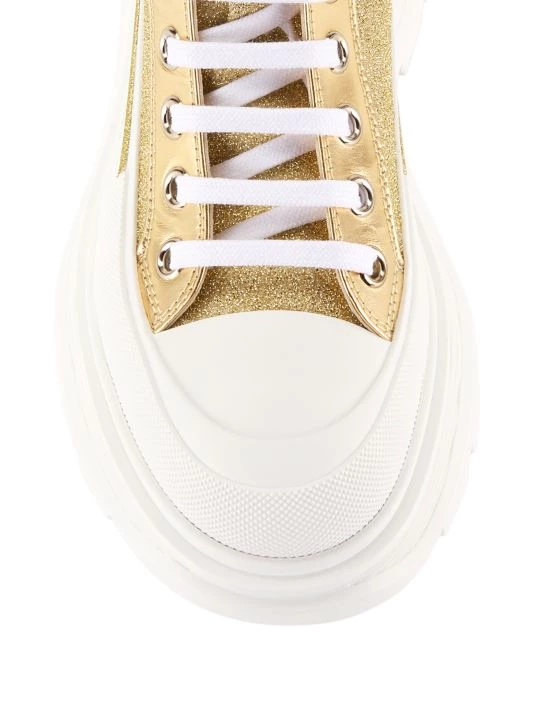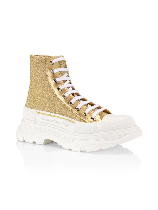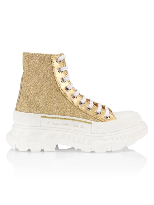 Mounted on a chunky lugged sole and platform, these utilitarian boot-inspired sneakers are dressed in glitter for a feminine touch.