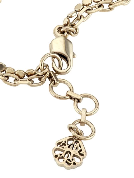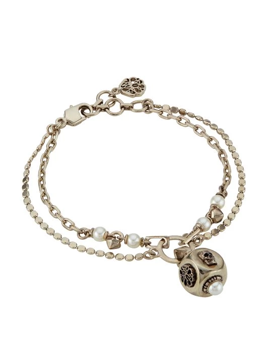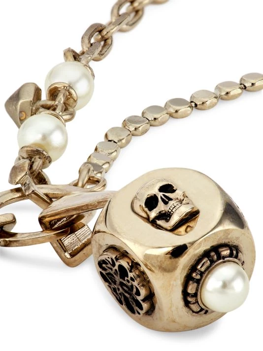 Alexander McQueen’s bracelet is crafted of pale goldtone brass. Featuring Swarovski pearl accents, this edgy style is detailed with a sculpted dice charm anchored by a double-layered chain.