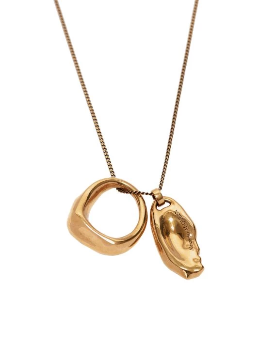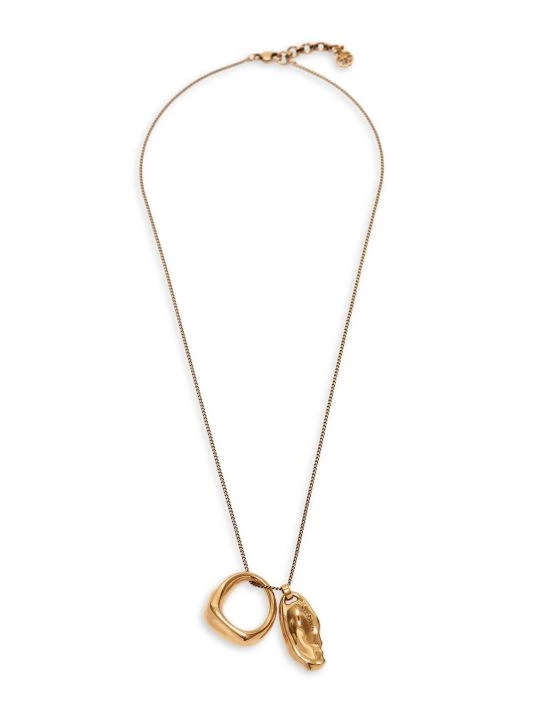This antiqued goldtone curb-chain necklace is adorned with two molten metal pendants for a bold, edgy effect.