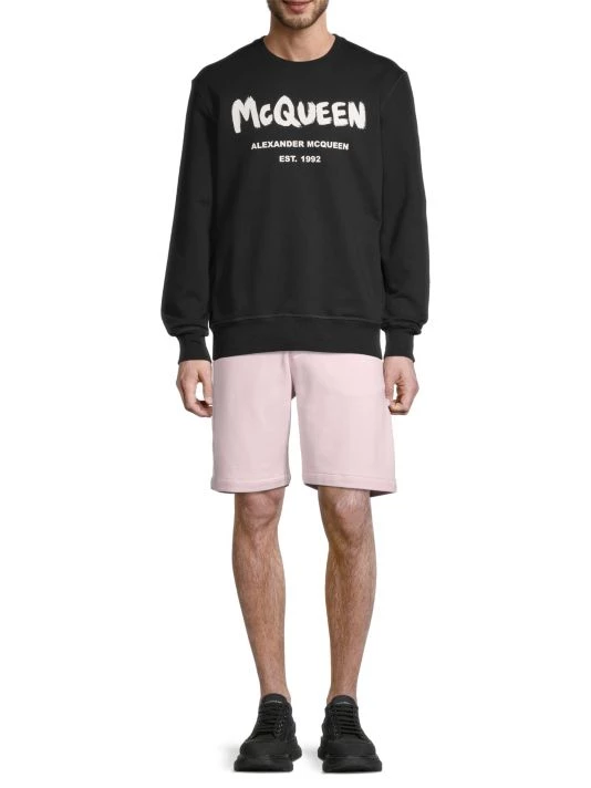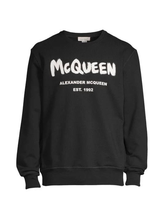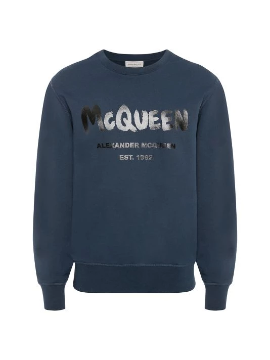 Inspired by London skies, this Alexander McQueen collection features cloud prints on linen, wool, and silk designs. Each piece encompasses casual and formal wear, from structured blazers to crewneck sweatshirts and spiked leather loafers, staying true to the brand’s slim-fit silhouettes. Crafted of cotton, this Alexander McQueen sweatshirt features the brand’s graffiti logo on the chest.