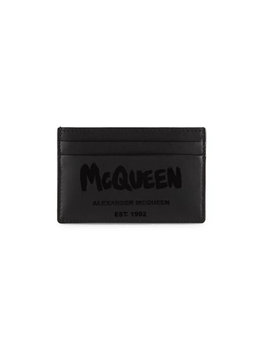This Alexander McQueen card holder is crafted of calfskin and features the brand’s grafitti logo on the front.