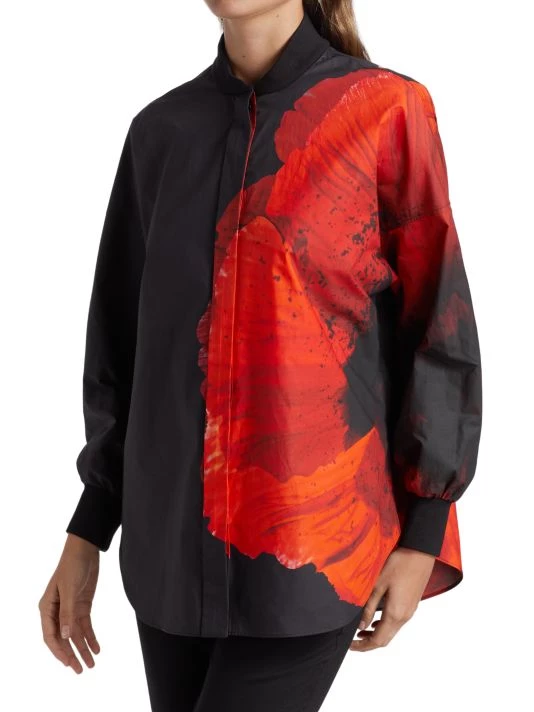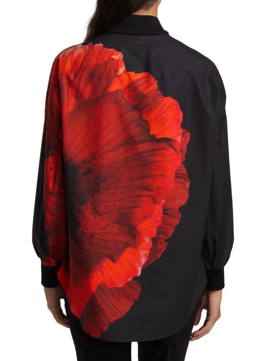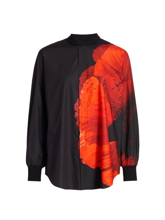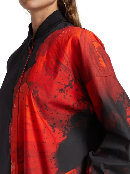 With a modern cocoon silhouette, this wool-cashmere blend shirt bursts with a vibrant floral graphic.