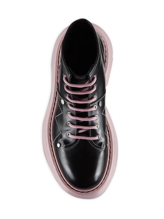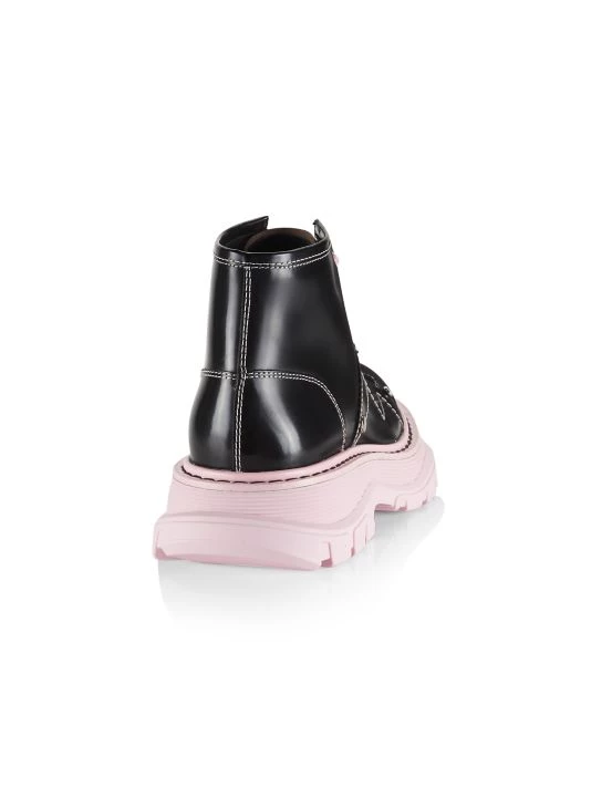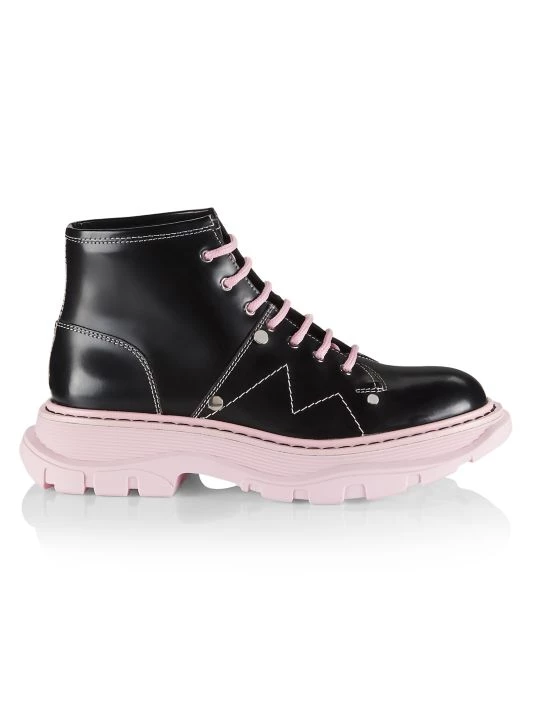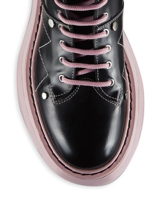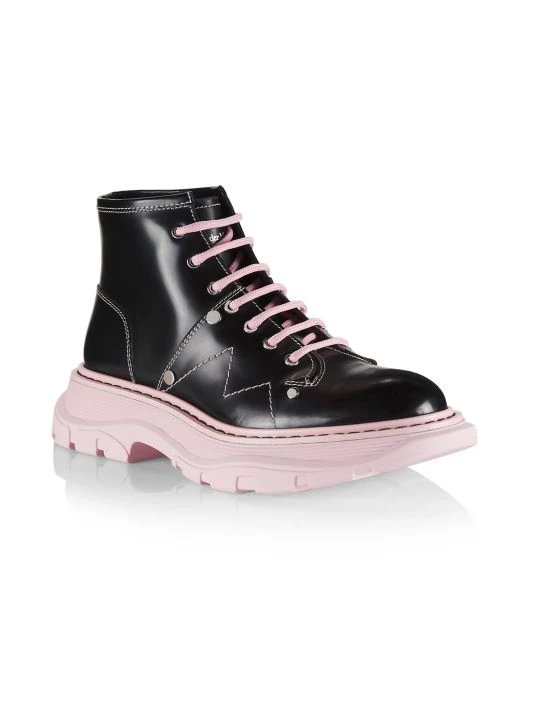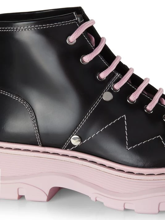Alexander McQueen’s Hyrbid lace-up boots are made in Italy of rich leather with contrast stitching. Anchored by achunky lugged sole inspired by the workwear of the Industrial Revolution,this pair is punctuated with metal studs.