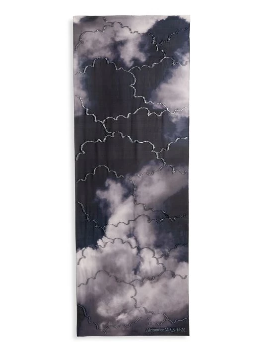 Made in Italy, Alexander McQueen’s Jeweled Cloud stole is crafted of delicate silk. This style is adorned with a cloud print with metallic trim.