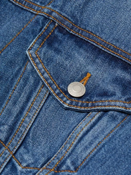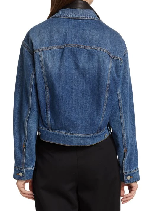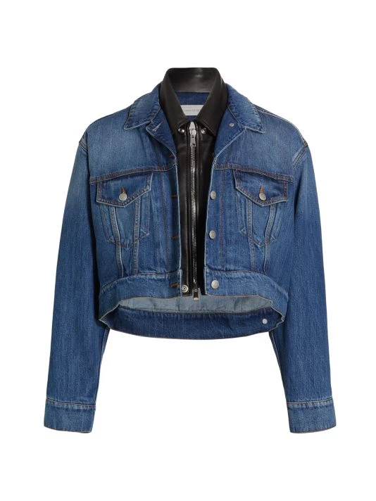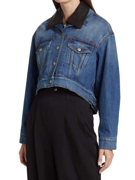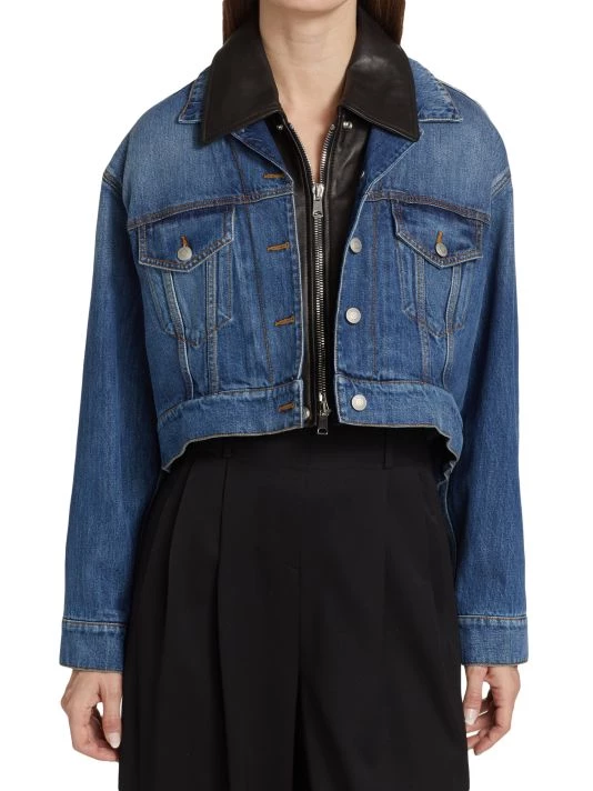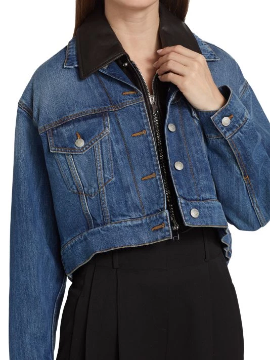 Cut in an ultra-cropped silhouette, this denim jacket is enhanced by layered lamb leather detailing.