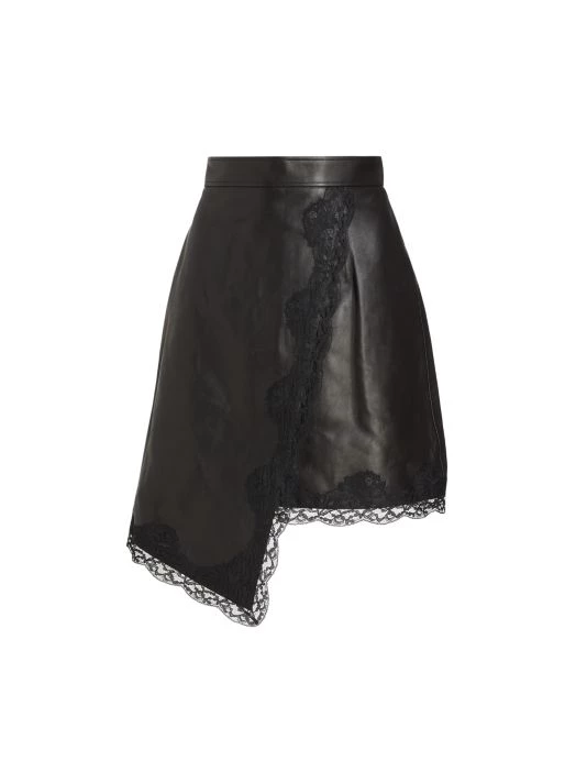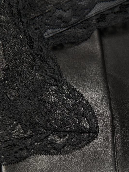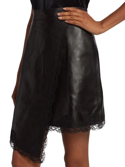 Crafted of smooth lamb leather is designed in an asymmetric silhouette with a delicate lace-trim.