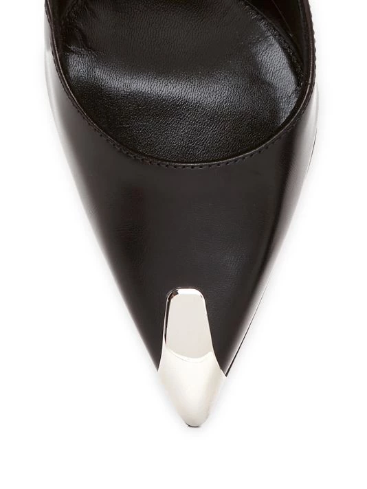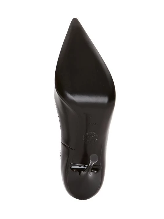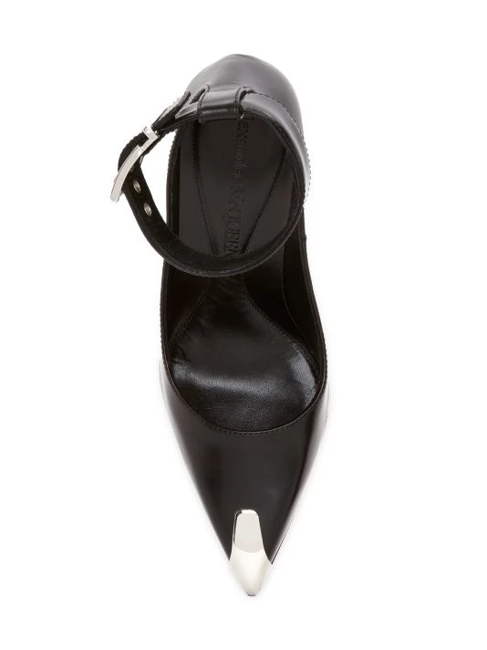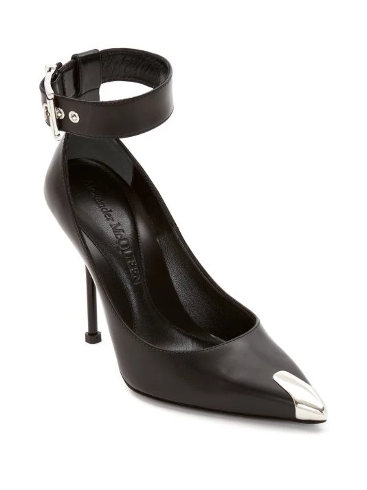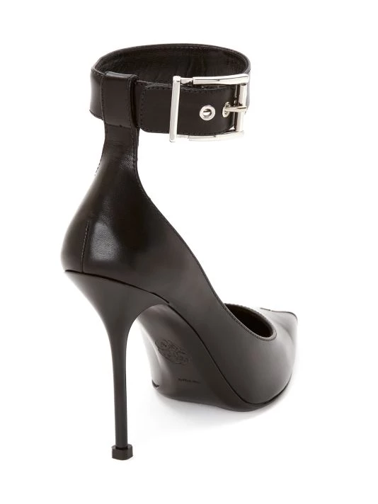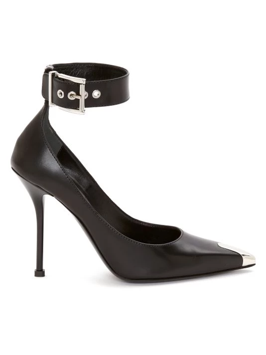 Made in Italy of rich leather, Alexander McQueen’s pumps flaunt a pointed toe with polished metal detail. This pair is fastened by a buckled strap.