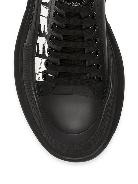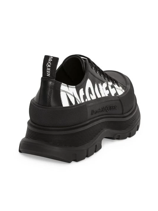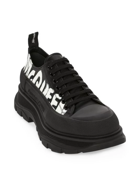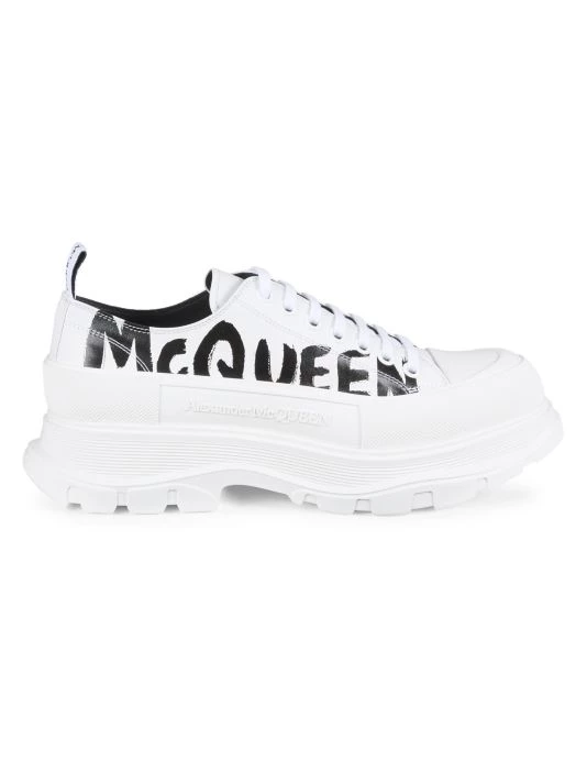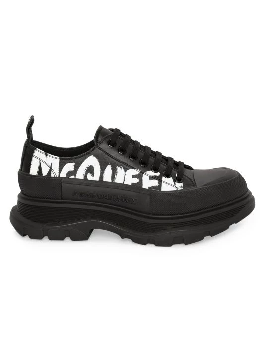 Inspired by London skies, this Alexander McQueen collection features cloud prints on linen, wool, and silk designs. Each piece encompasses casual and formal wear, from structured blazers to crewneck sweatshirts and spiked leather loafers, staying true to the brand’s slim-fit silhouettes. These leather sneakers feature the brand name on the side.