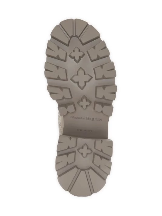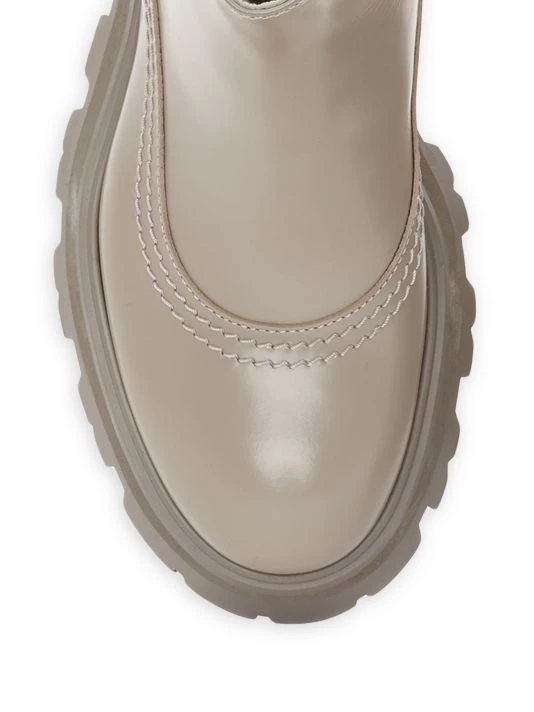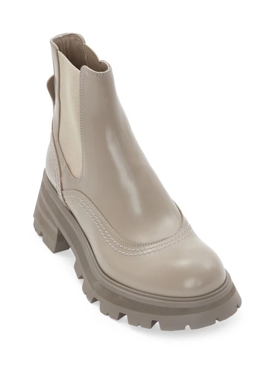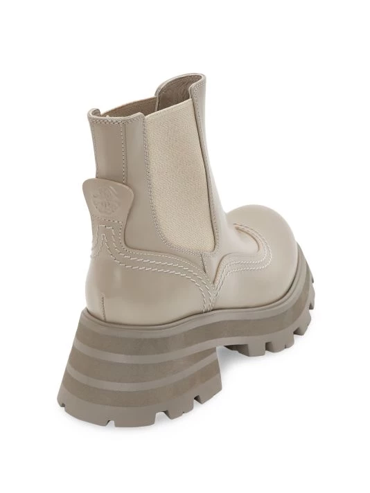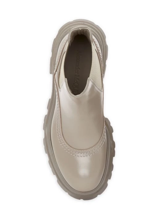 Elevated by a platform-lugged sole, Alexander McQueen’s Chelsea boots are crafted of smooth leather with elasticized gussets. This Italian-made pair is finished with a signature embossed seal motif at the back.