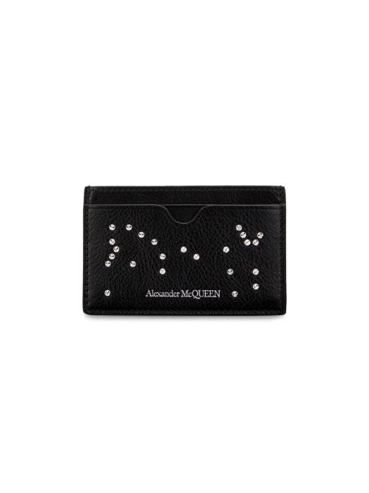 Grained leather card holder highlighted with silvertone studs and understated metallic logo.