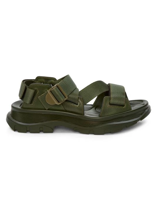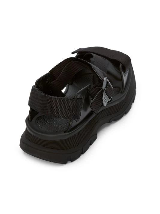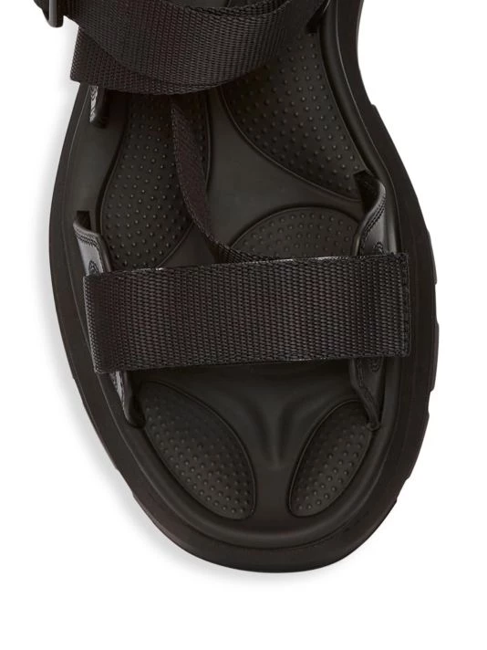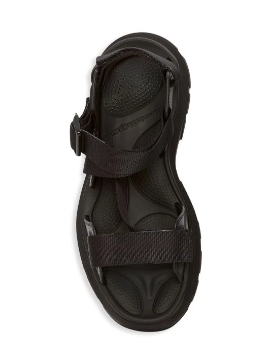 These sandals feature an oversize sole and woven straps finished with the brand’s engraved signature.