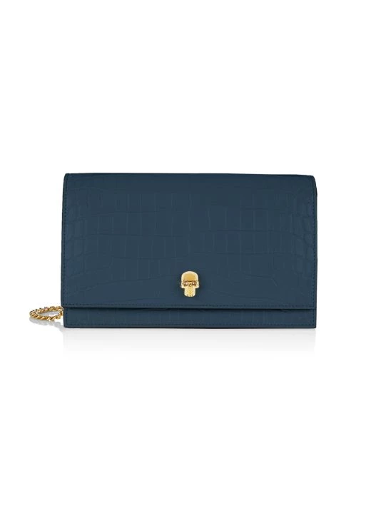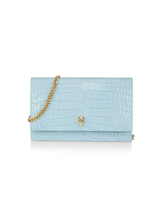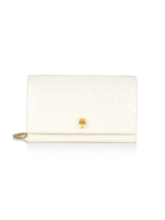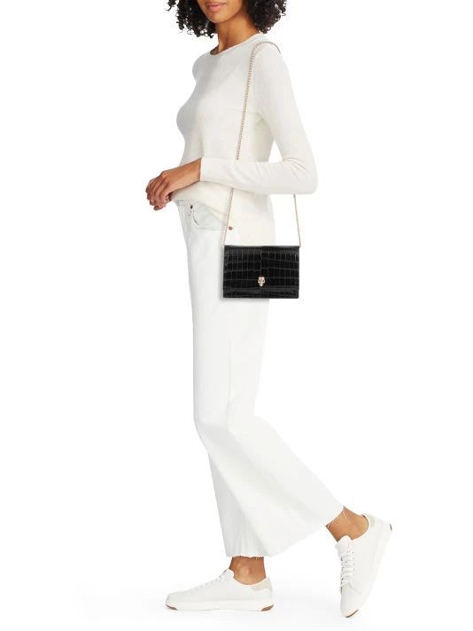 Sleek leather crossbody bag elevated with a croc-embossed finish and delicate skull accent.