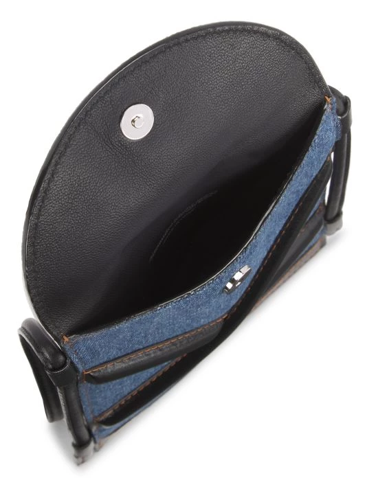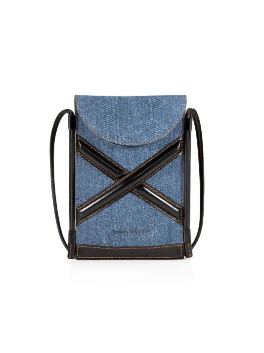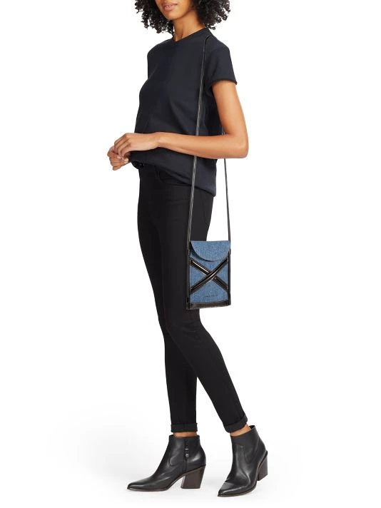 This slim denim pouch is highlighted with contrast leather wraparound trim.