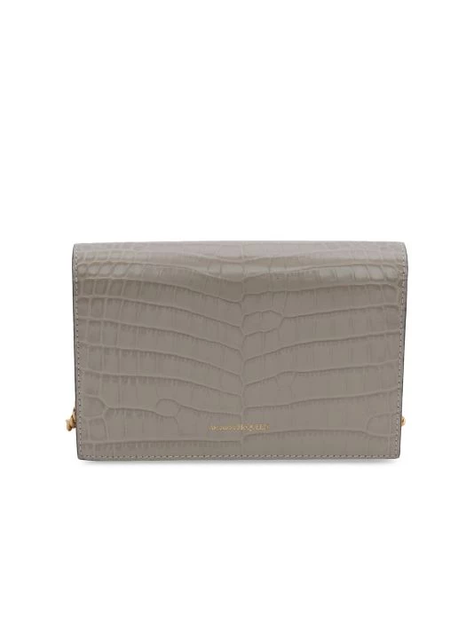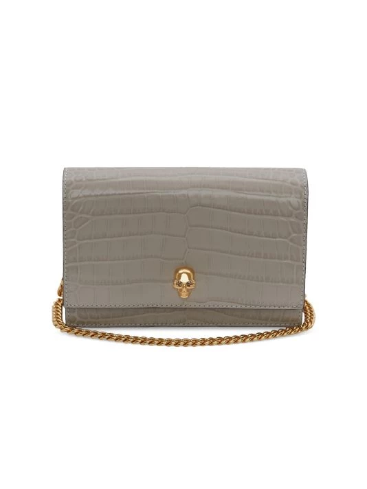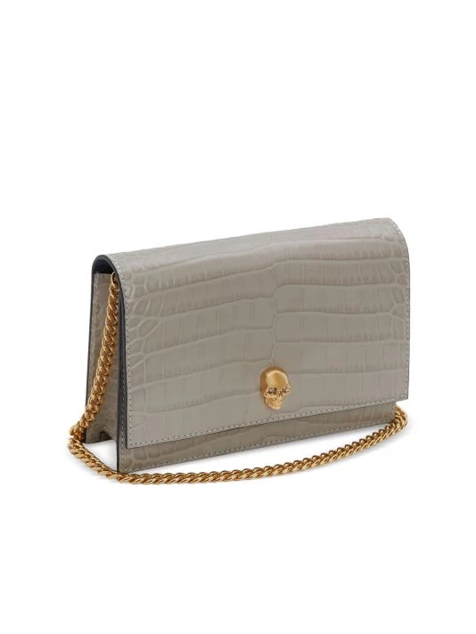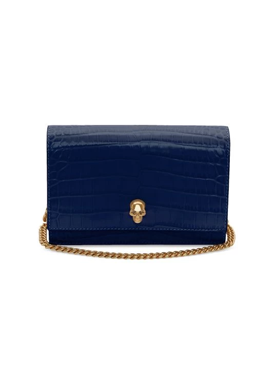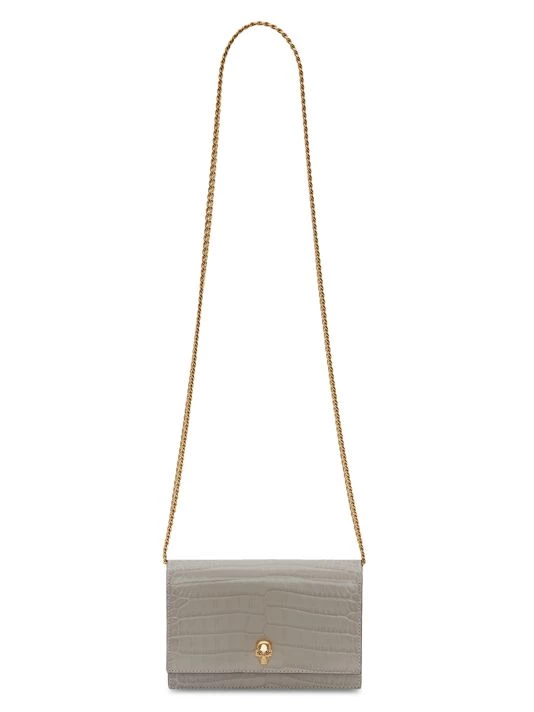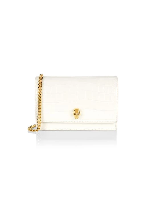 Sleek leather crossbody bag elevated with a croc-embossed finish and delicate skull accent.