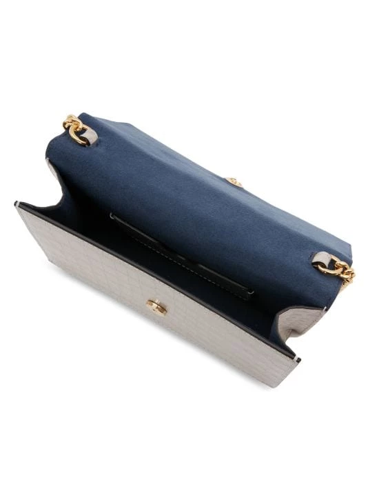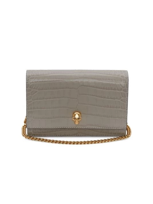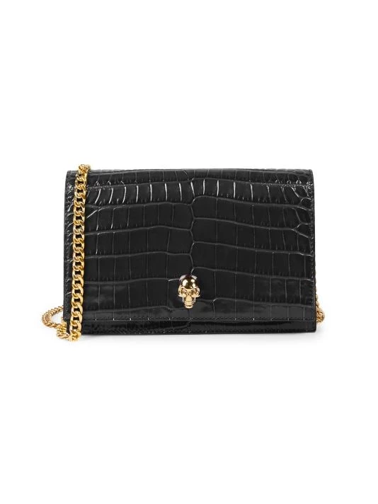Sleek leather crossbody bag elevated with a croc-embossed finish and delicate skull accent.