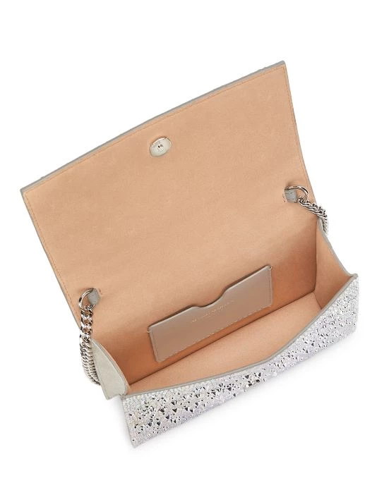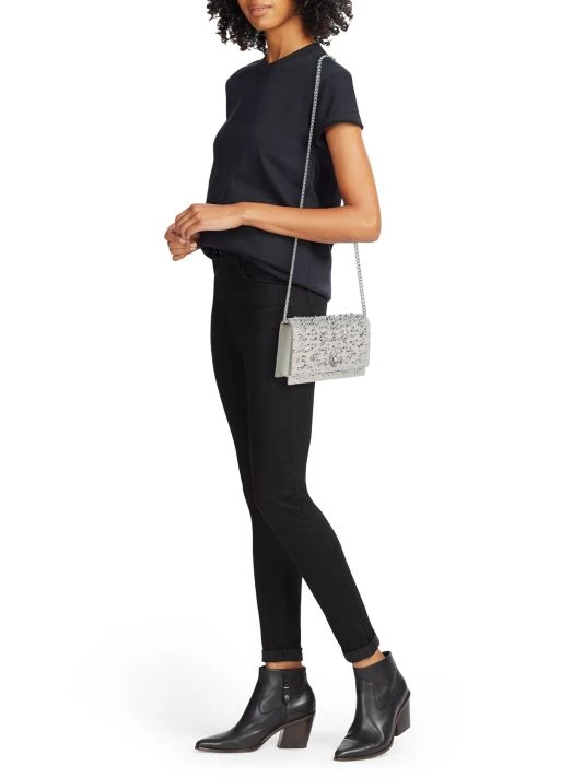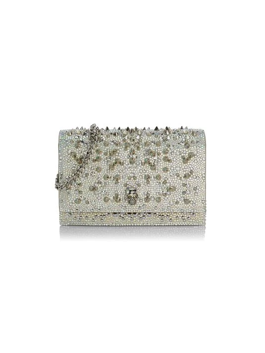 Adorned with the signature skull charm, Alexander McQueen’s shoulder bag is decorated with gleaming crystals and spiked studs. A lightweight chain strap accompanies this piece for hands-free ease.